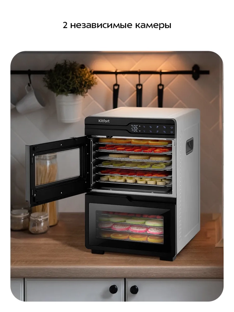 Сушилка имеет две независимые камеры, в каждую из которых может быть установлено по 6 металлических поддонов. В комплект входит 12 металлических поддонов, 12 сплошных пластиковых поддонов и 12 сеток.