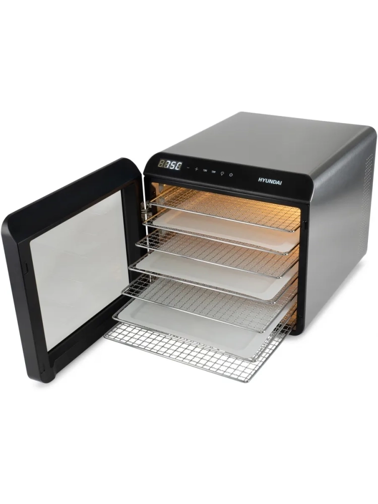 Управление осуществляется с помощью интуитивно понятной сенсорной панели, а встроенный таймер позволяет контролировать процесс сушки с точностью до минуты. Широкая открывающаяся дверца обеспечивает удобный доступ к поддонам, а внутренняя лампа подсветки позволяет следить за процессом сушки без необходимости открывать камеру и нарушать температурный режим. Металлический корпус гарантирует долговечность и надежность устройства, а стильное сочетание серебристого и черного цветов делает его гармоничным дополнением любого интерьера.
