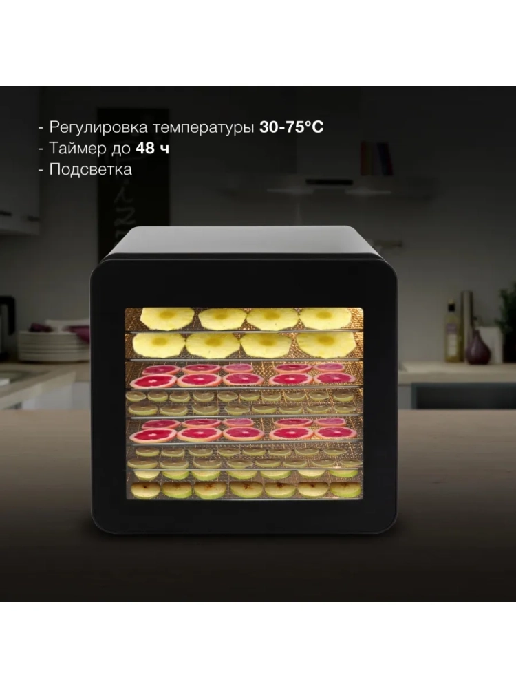 Оборудована 600-ваттным нагревательным элементом, обеспечивающим равномерную циркуляцию тепла и эффективное обезвоживание продуктов. С 7 уровнями сушки и 14 просторными поддонами Вы сможете легко обработать большой объем ингредиентов, экономя время и усилия. Регулировка температуры в диапазоне от 30°C до 75°C позволяет точно настроить режим сушки для разных видов продуктов, будь то сочные фрукты, нежные овощи или ароматные травы. Идеально подходит для приготовления вяленого мяса и рыбы.