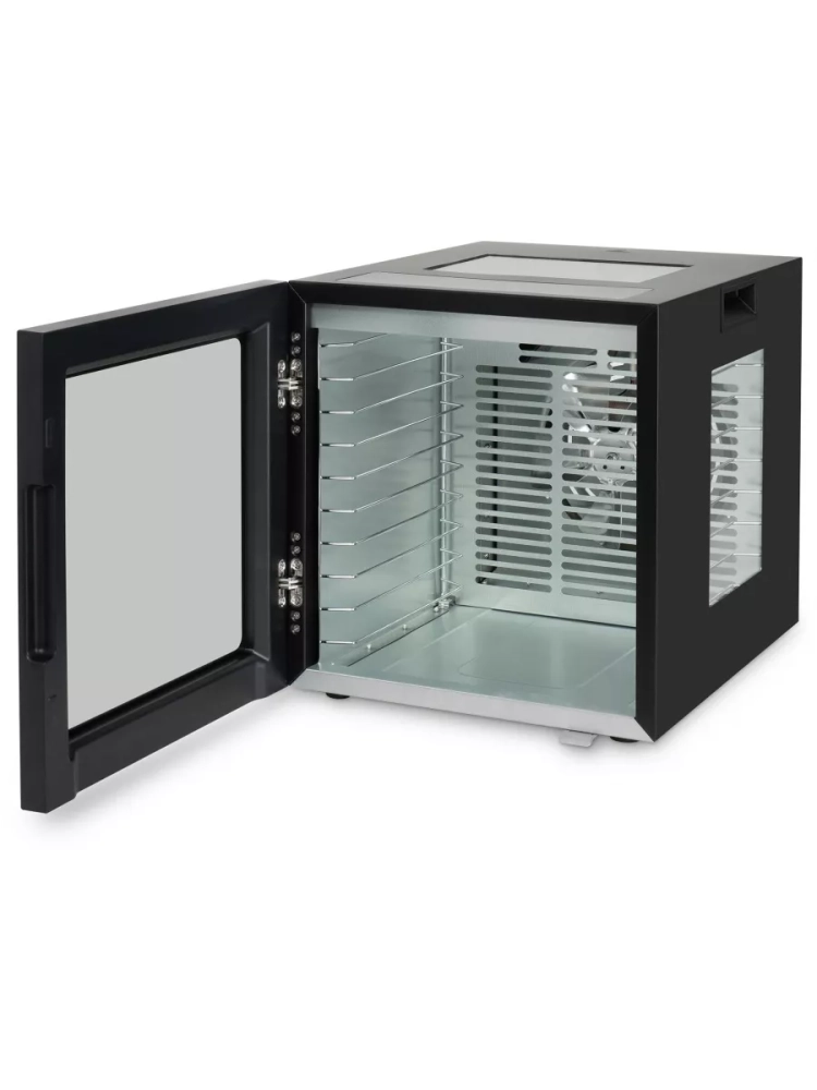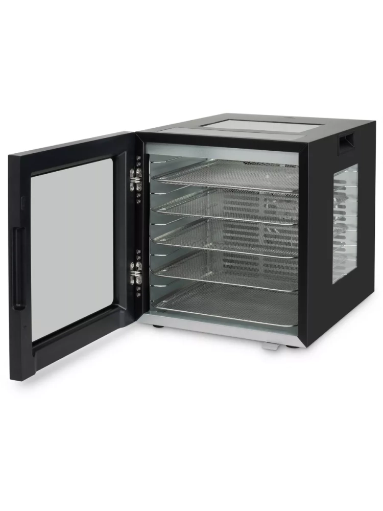 Особенностью модели HYFD-8804 являются два смотровых окна, расположенных сверху и сбоку. Они позволяют наблюдать за процессом сушки со всех сторон, не открывая дверцу и не нарушая микроклимат внутри камеры. Широкая открывающаяся дверца обеспечивает легкий доступ к поддонам для удобной загрузки и выгрузки продуктов. Встроенная лампа подсветки дополнительно упрощает контроль за процессом сушки.