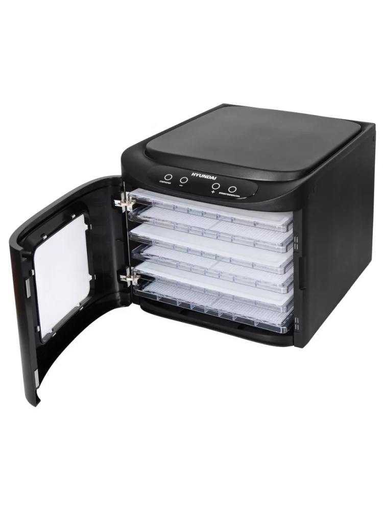 Сушка для фруктов и овощей Hyundai HYFD-P1203 черный, мощность 500Вт, поддонов: 12шт, температура сушки от 35С до 70С. Вертикальное размещение вентилятора дает лучшую просушку без необходимости преставления поддонов. Интуитивное управление, таймер до 19ч. В комплекте 6 пластиковых поддонов для сушения, 3 поддона для приготовления пастилы, 3 поддона для сушения трав и мелких продуктов.