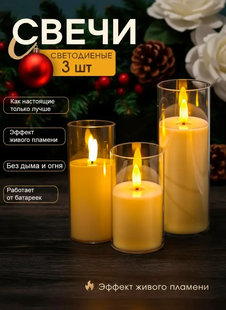 Подарите себе и своим близким атмосферу тепла и уюта. Откройте двери в мир романтики и спокойствия с нашим набором светодиодных свечей. Не упустите возможность сделать ваш дом по-настоящему уютным! Заказывайте прямо сейчас и наслаждайтесь каждым мгновением!