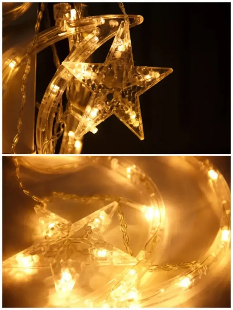 Длина гирлянды: 3м. Длина шнура: 90см. Длина луны: 18см. Длина звезды: 10 см. Комплектация: гирлянда состоит из 6 лун и 6 звезд, led-лампочки по периметру, 2 вилки: для подключения в розетку 220В и для соединения гирлянд между собой. Цвет свечения: золотистый, теплый белый.