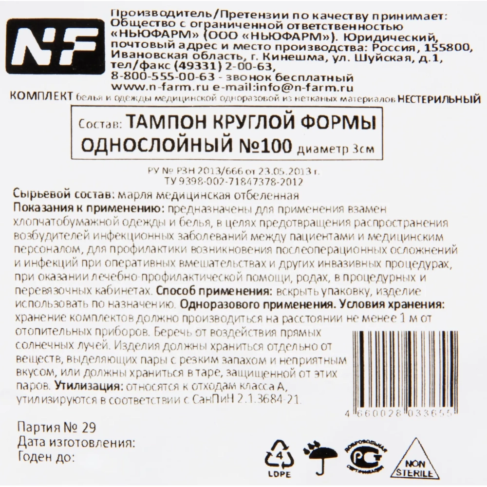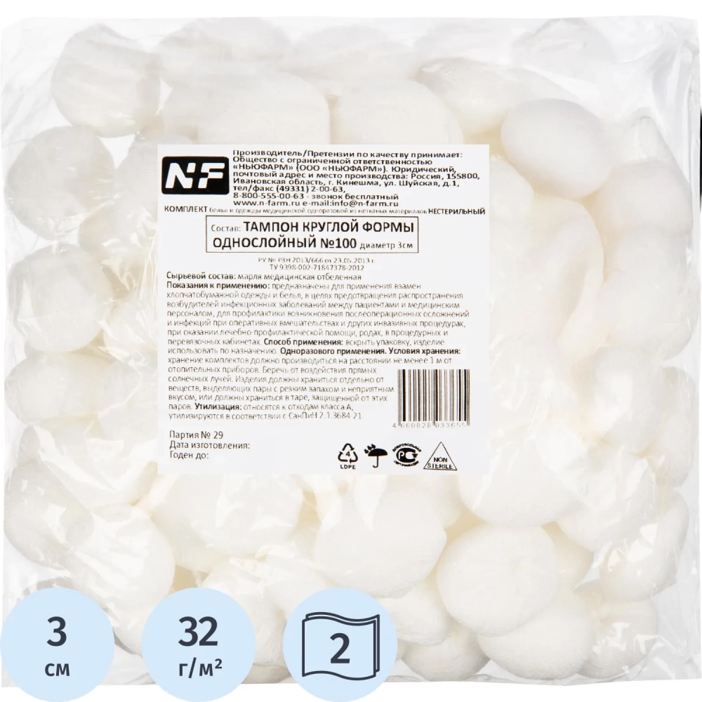 Тампоны марлевые,круг.,н/ст,пл.32,диам.3 см,100шт/уп ШК33655