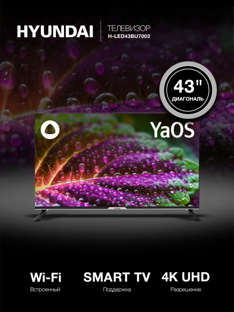 Hyundai H-LED43BU7003 – это эргономичный телевизор из линейки Яндекс ТВ, выполненный по всем современным стандартам и поддерживающий функции умного телевидения.
