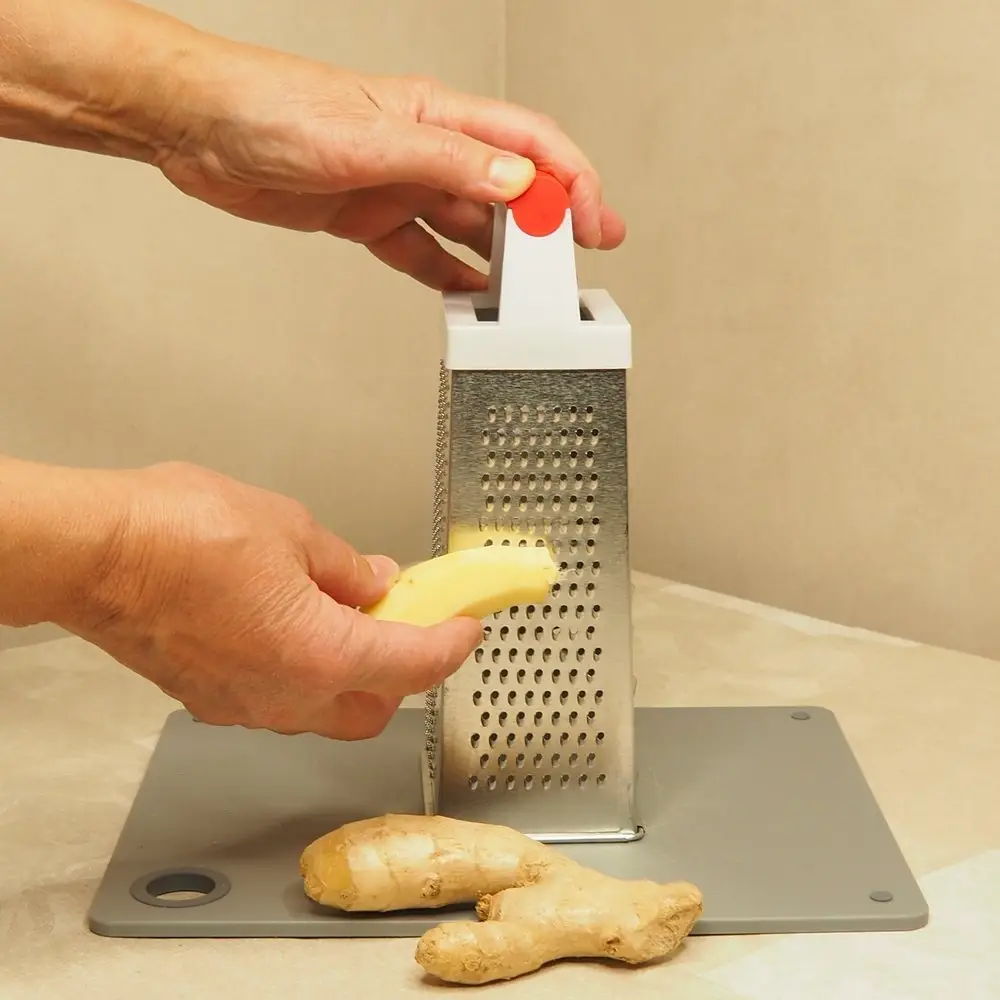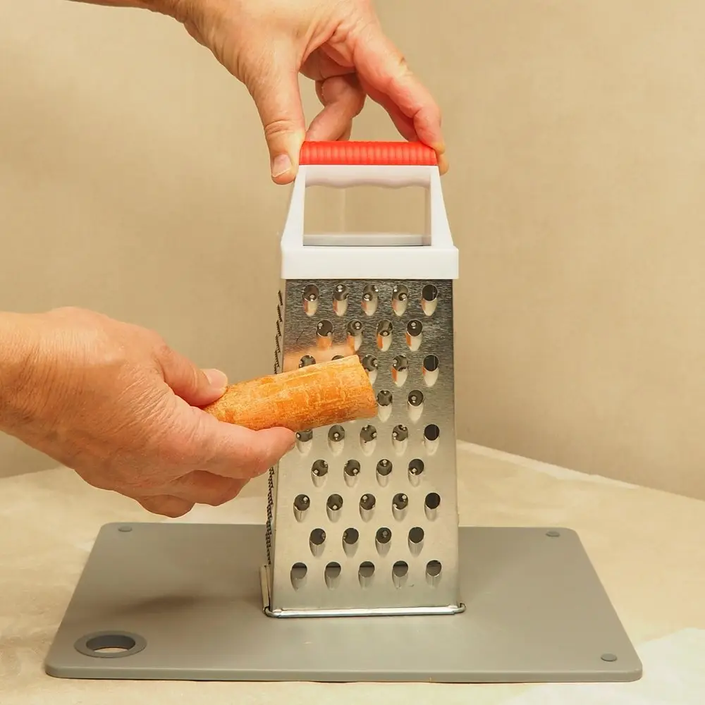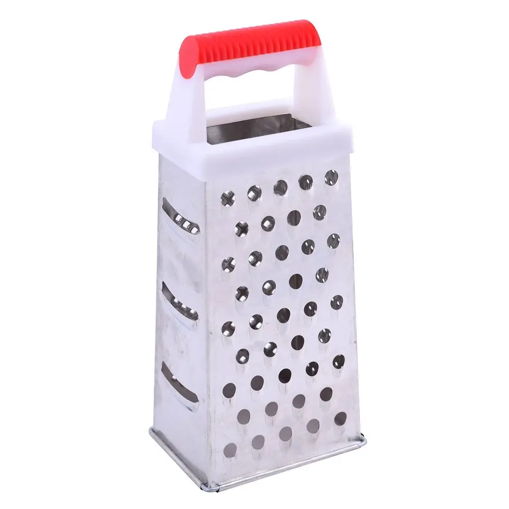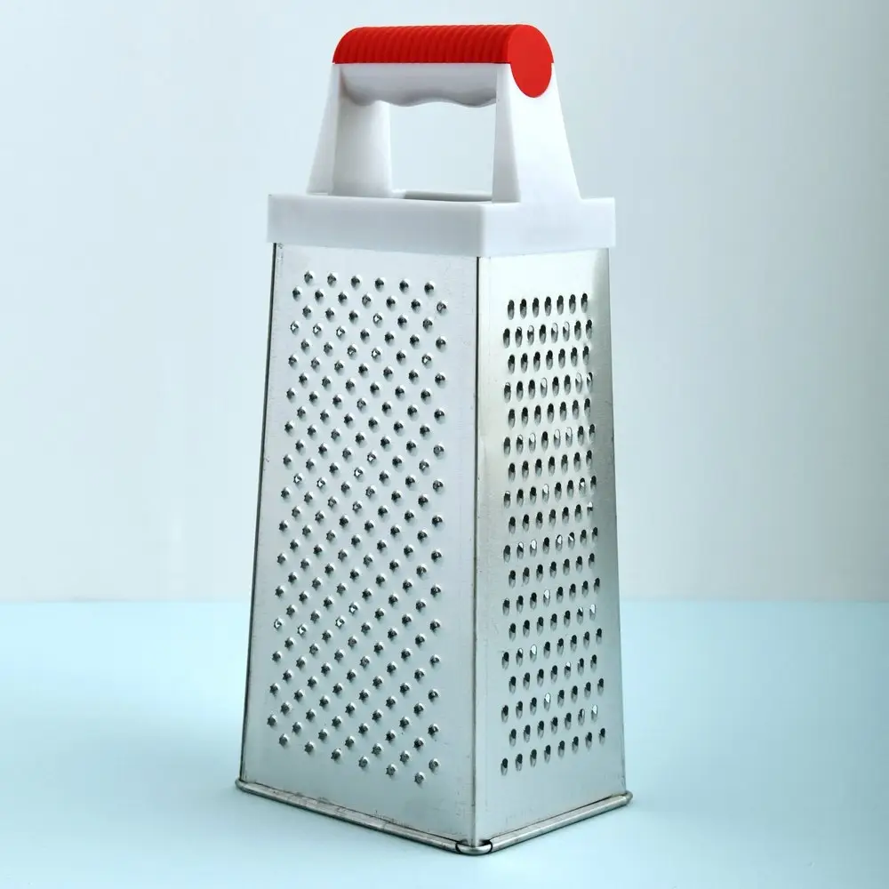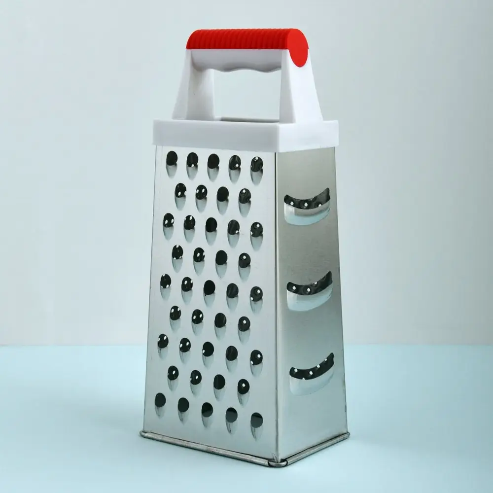 Очень многие блюда содержат измельченные ингредиенты, которые нужно натереть на терке. Универсальным приспособлением для этого станет четырехгранная терка, по двум сторонам которой расположены крупная и мелкая терка для моркови, яиц, лука. По двум другим расположились насечки для получения цедры и три крупных отверстия для нарезки ломтиками. Чтобы натереть продукты, поставьте инструмент на стол, прижмите и удерживайте за ручку одной рукой. Второй рукой натирайте продукты на нужной вам грани. Чтобы не повредить пальцы, натирайте только крупные части продуктов. Рабочая поверхность четырехсторонней терки выполнена из коррозионностойкой стали, ручка – из пластмассы, высота изделия 24 см. Уход за изделием прост: после использования промывайте водой, удаляя щеткой пищевые отходы.