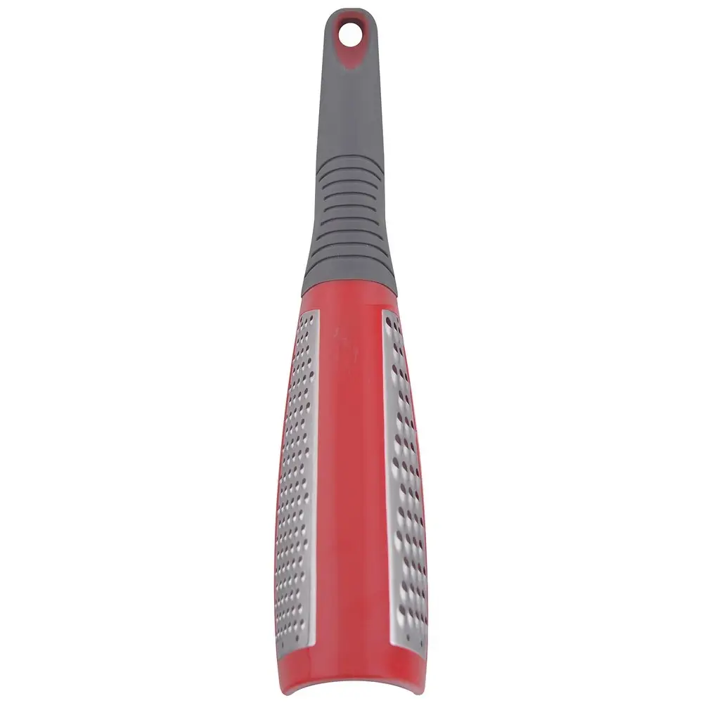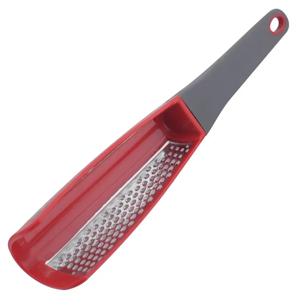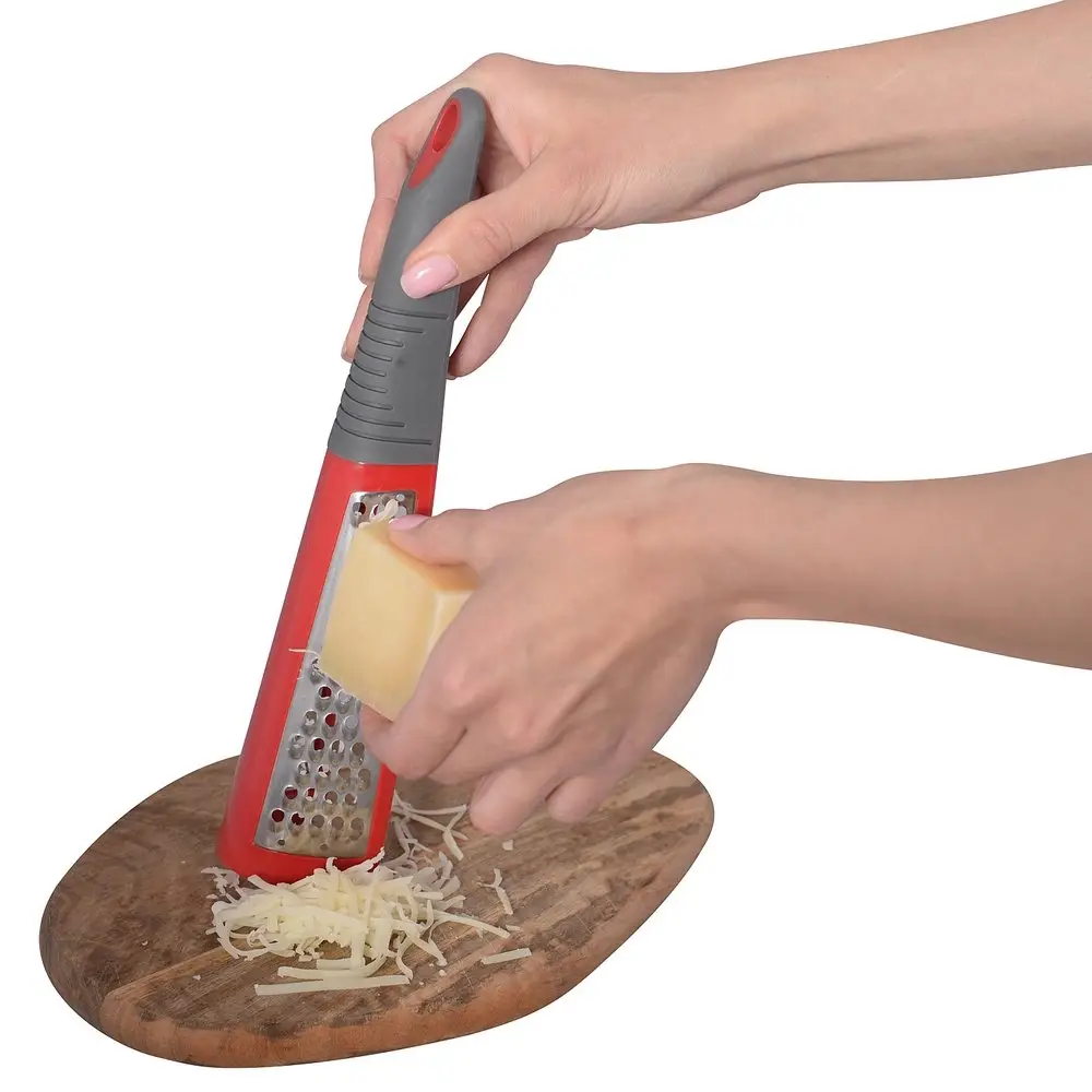 Удобная терка для сыра будет всегда у вас под рукой. Удобна в использовании, измельчает продукты различным срезом, не занимают много места и легко моется после использования. С помощью терки вы легко сможете измельчить сыр, овощи, фрукты и пр. продукты. Нет необходимости размещать доску, чтобы натереть продукты. Потрите их прямо над блюдом! С этой теркой сделать это очень просто, т.к. ее удобно держать в руке. Общая длина 29см. Изготовлено: коррозионностойкая (нержавеющая) сталь, пластмасса (ABS, TPR).