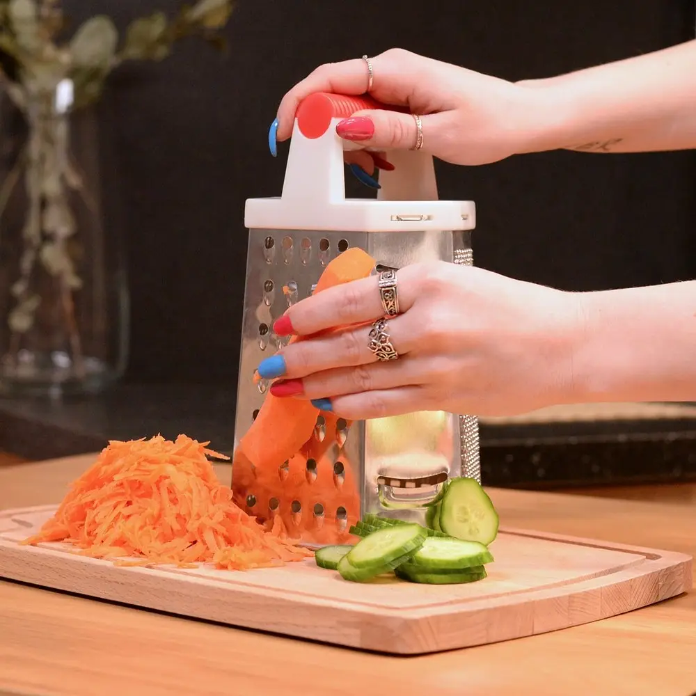 Для приготовления горячих блюд, салатов, закусок, украшения выпечки и кондитерских изделий очень часто нужно измельчить ингредиенты. Шестигранная терка – удобное кухонное приспособление с отверстиями и насечками шести типов: мелкая и средняя терки, крупная терка, шинковка, фигурная шинковка и шредер. Пользоваться изделием легко: поставьте терку на стол, одной рукой держите за ручку. Второй рукой возьмите продукт, прижмите к нужной вам грани и начинайте тереть, направляя движения вниз. Натирайте только крупные части, чтобы не повредить пальцы. Рабочая поверхность выполнена из коррозионностойкой стали, ручка – из пластмассы, высота изделия 22 см. Уход за изделием прост: после использования промывайте водой, удаляя щеткой остатки пищи.