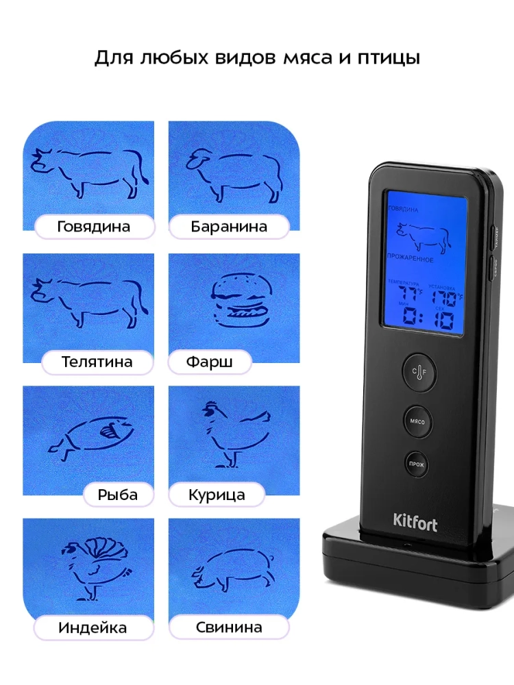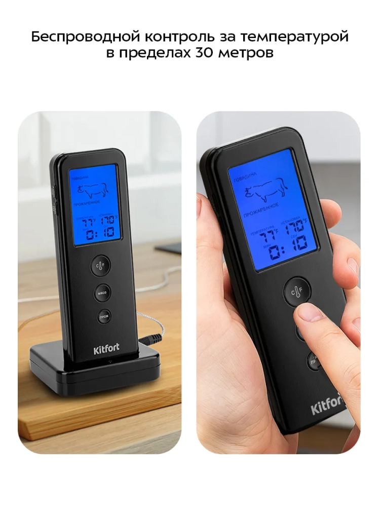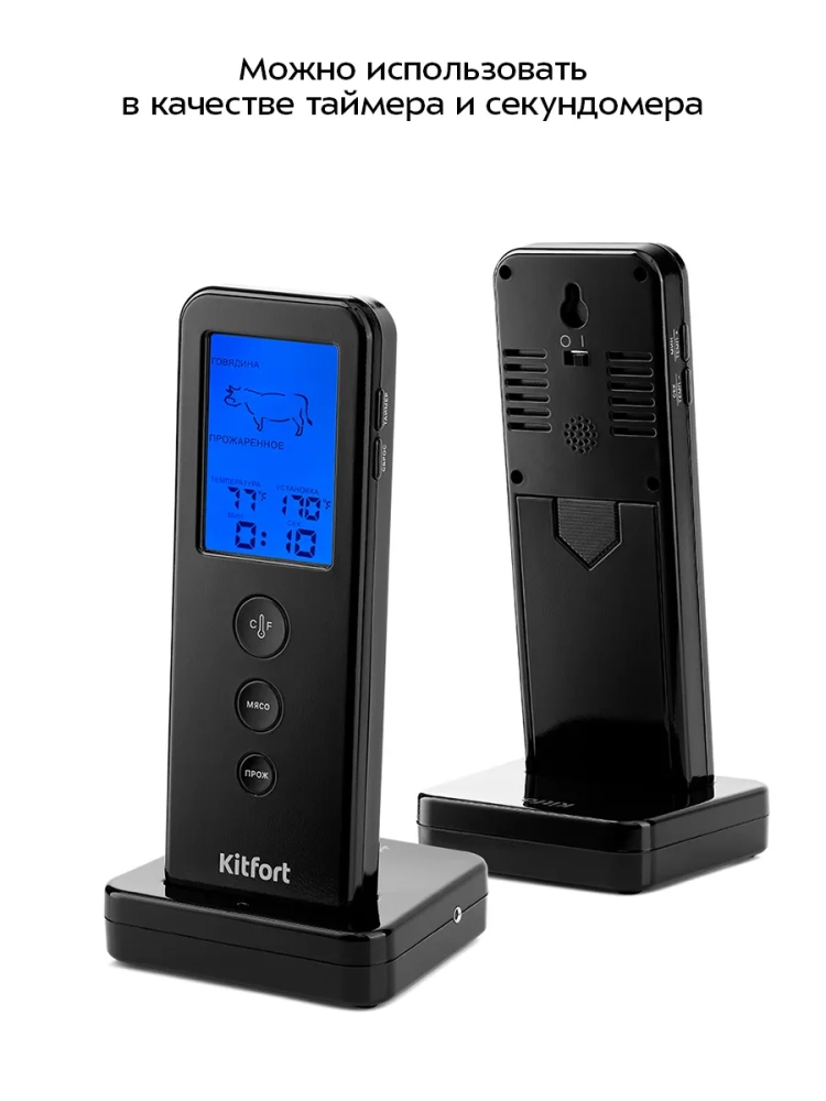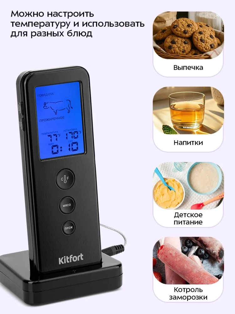 Термометр для мяса Kitfort KT-2067 предназначен для определения готовности и степени прожарки мяса. Ценители стейков смогут точно определить степень прожарки и вовремя закончить термическую обработку мяса. Обычно рекомендуют определять прожарку стейка по секундомеру или «на ощупь» (по текстуре мяса). Однако ни один из этих способов не гарантирует точного результата. Единственный точный способ определить степень прожарки стейка — измерить температуру в центре стейка. Для этого служит специальный прибор — термометр для мяса, состоящий из термощупа, шнура и блока управления с базой.