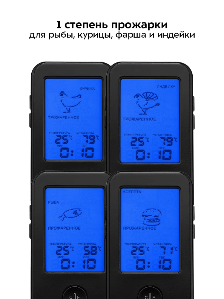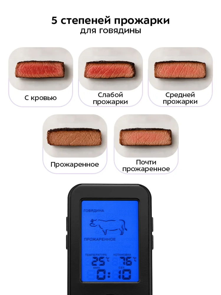 В термометре для мяса вы можете выбрать вид мяса: говядина, баранина, телятина, котлета, свинина, индейка, курица или рыба. Таким образом термометр можно использовать не только с предустановленными настройками или не только для разных видов мяса, но и для выпечки или других блюд.