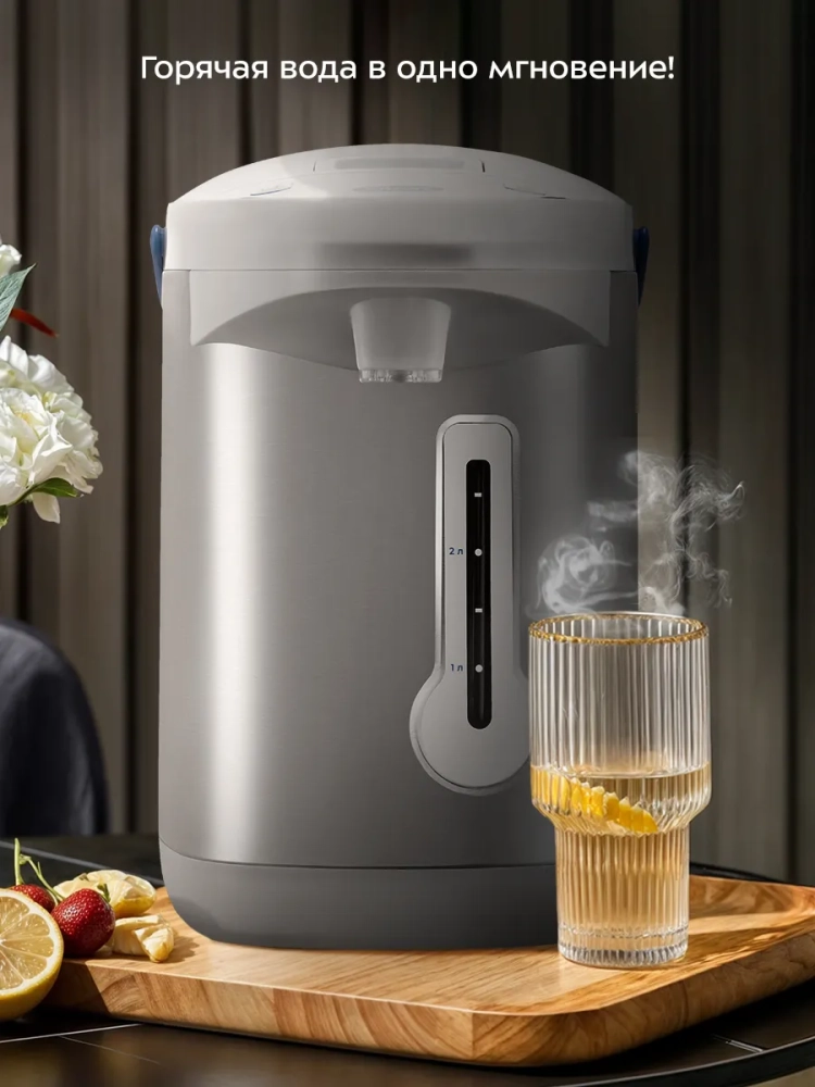 Двойные стенки термопота помогают сохранить тепло и реже включать нагрев, что позволяет экономить электроэнергию. Корпус термопота состоит из пластика и нержавеющей стали, а резервуар — из нержавеющей стали. Внутренняя часть крышки также сделана из нержавеющей стали, поэтому вода не соприкасается с пластиковыми частями устройства.