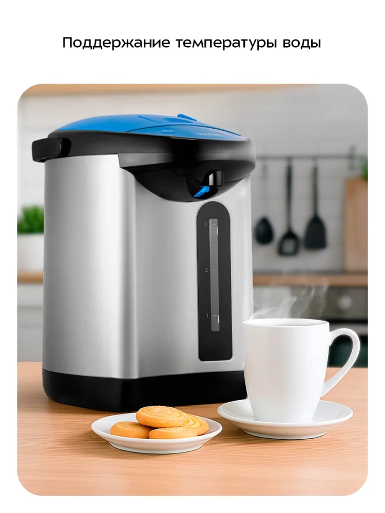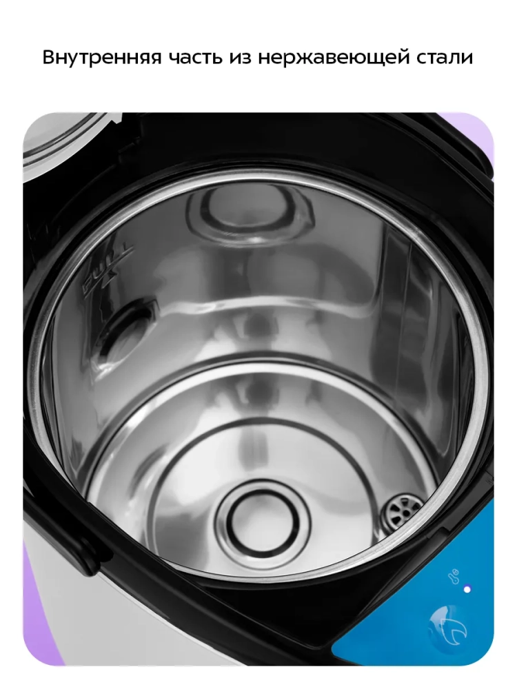 Двойные стенки термопота помогают сохранить тепло и реже включать нагрев, что поможет сэкономить на электроэнергии. Корпус термопота состоит из пластика и нержавеющей стали, а резервуар — из нержавеющей стали. Внутренняя часть крышки также сделана из нержавеющей стали, поэтому вода не соприкасается с пластиковыми частями устройства.