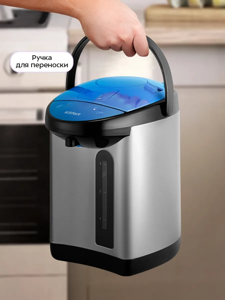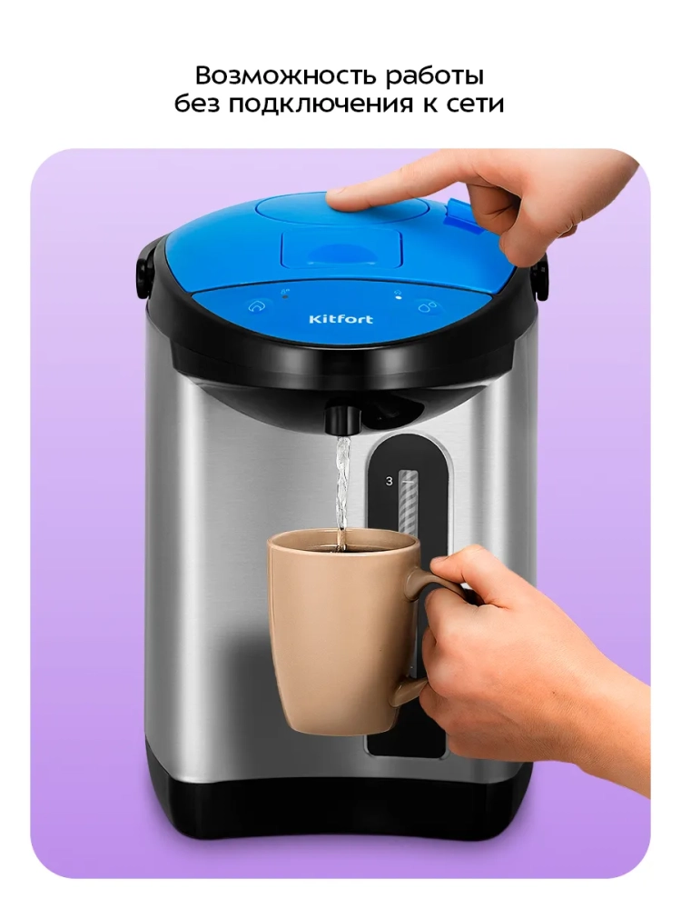 Термопот Kitfort КТ-2540 служит для кипячения воды и поддержания ее температуры за счет периодического включения и отключения нагрева. Отличие термопота от обычного чайника в том, что термопот поддерживает температуру воды, поэтому она может оставаться горячей долгое время, если вам это необходимо.