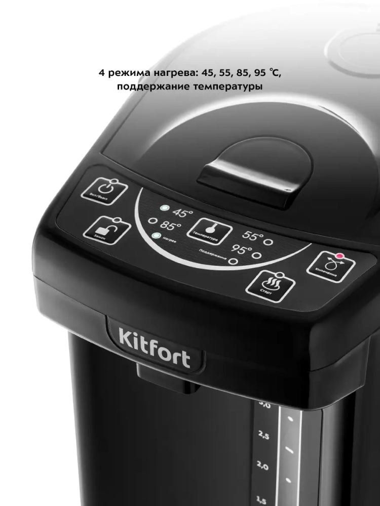 Термопот Kitfort КТ-2508 служит для кипячения и поддержания температуры воды на заданном уровне с помощью периодического включения и отключения нагрева. Термопот Китфорт оснащен функцией выбора температуры и может не только вскипятить воду, но и нагреть ее до температуры 45, 55, 85, 95 *С, что очень удобно при заваривании различных сортов чая, приготовлении кофе и подогрева детского питания. Термопот также оснащен функцией поддержания температуры. Температура воды контролируется термодатчиком, встроенным в дно резервуара для воды. Термопот будет держать установленную температуру, пока его не отключат. Термопот имеет двойные стенки для сохранения тепла и экономии электроэнергии. Корпус термопота состоит из окрашенной нержавеющей стали и вставок из пластика. Функция Замок не позволит получить ожог при случайном включении, а также защитит от случайных нажатий на кнопки детьми. Термопот поддерживает выбранную температуру и у вас всегда в готовности горячая вода.
