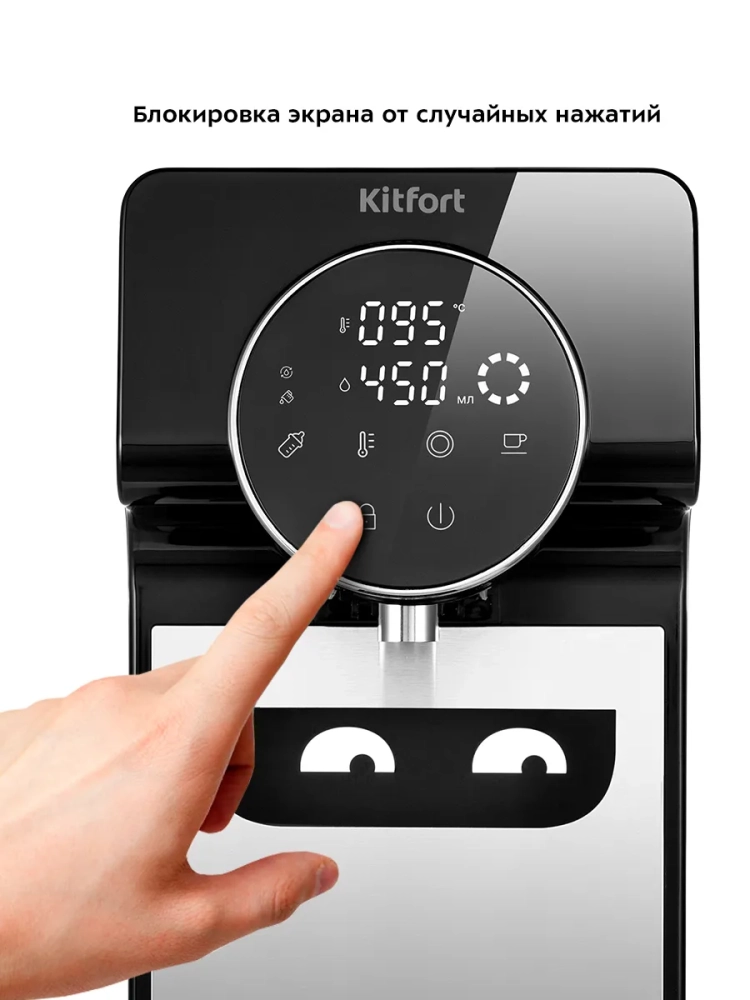 Блокировка экрана не позволит получить ожог при случайном включении подачи воды или испортить поверхность стола кипятком, а также защитит от случайных нажатий на кнопки детьми.