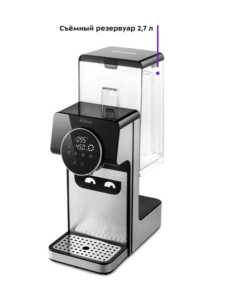 Термопот Kitfort КТ-2510 служит для моментальной подачи воды заданной температуры без предварительного подогрева и ожидания. Термопот не потребляет электричество в режиме простоя. Подогрев осуществляется проточно, подача воды начинается в течение примерно 5 секунд после нажатия кнопки — столько времени занимает нагрев до температуры кипения.