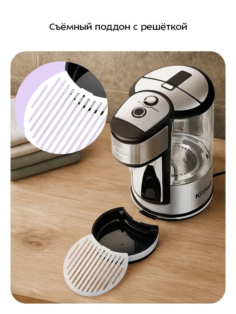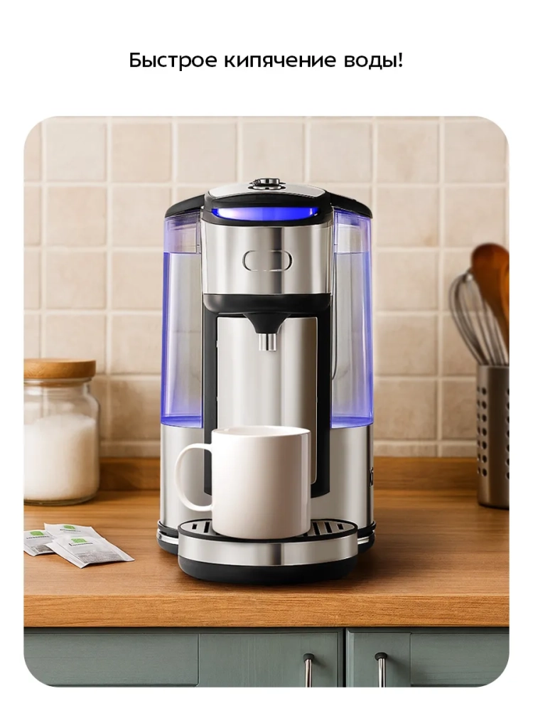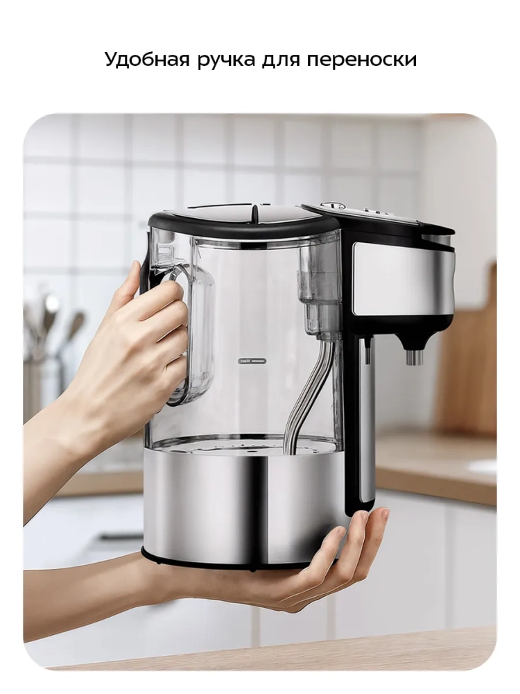 Резервуар для воды оборудован удобной ручкой для переноски. Поддон с решеткой защищают поверхность, на которую установлен термопот, от капель воды.