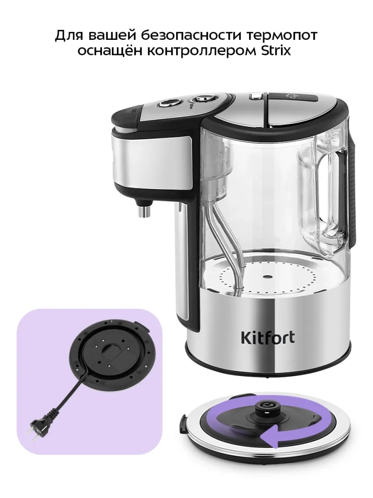 Термопот оснащён контроллером Strix, который уменьшает риск короткого замыкания и возгорания прибора, а также обеспечивает защиту при включении термопота без воды.