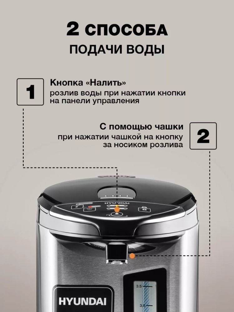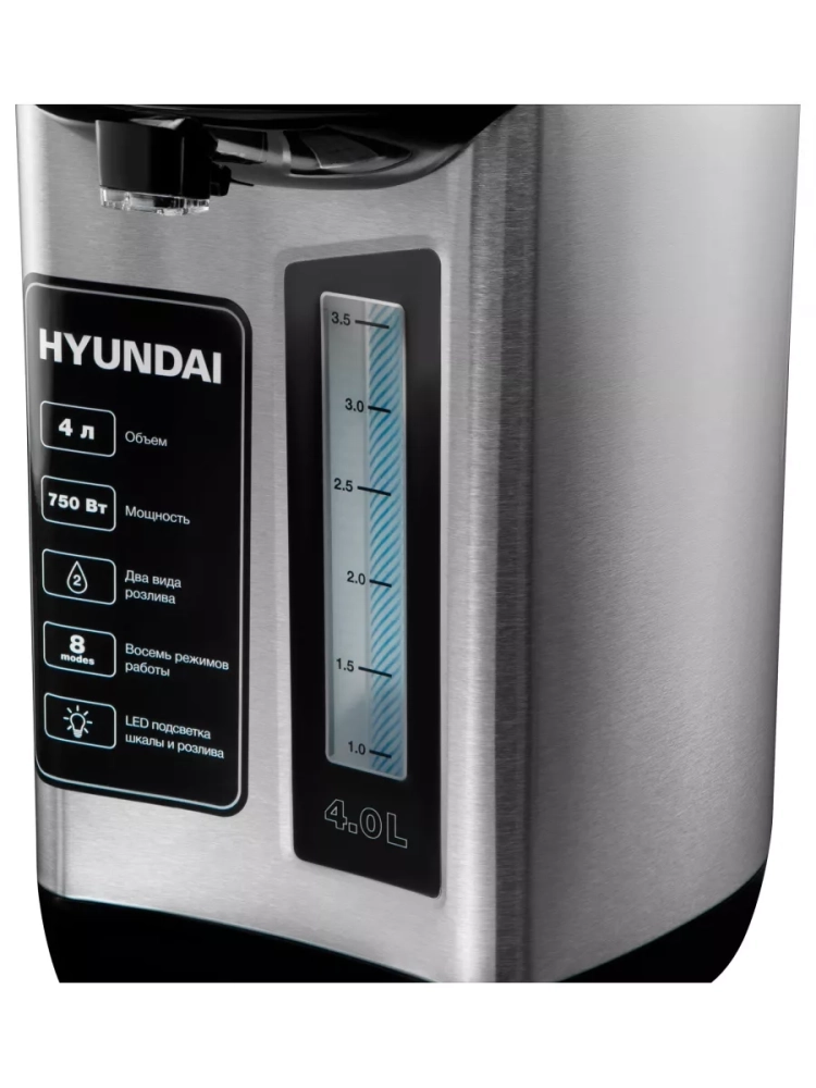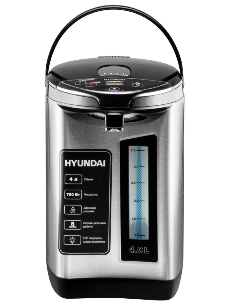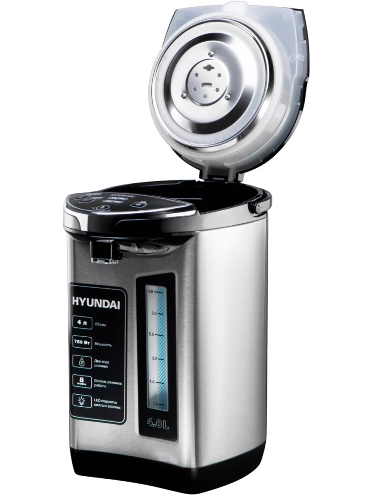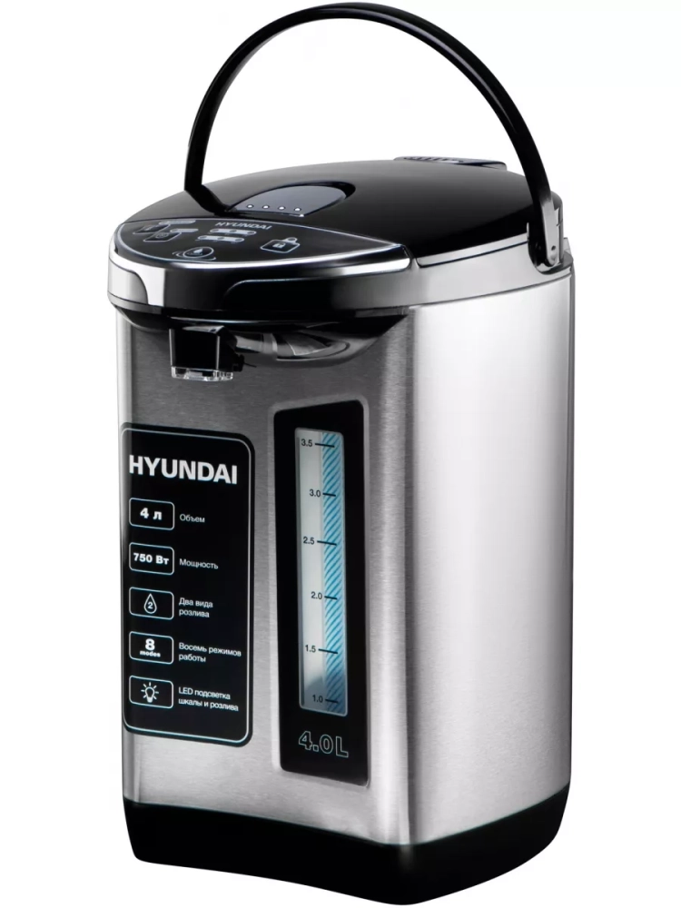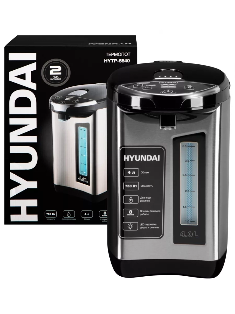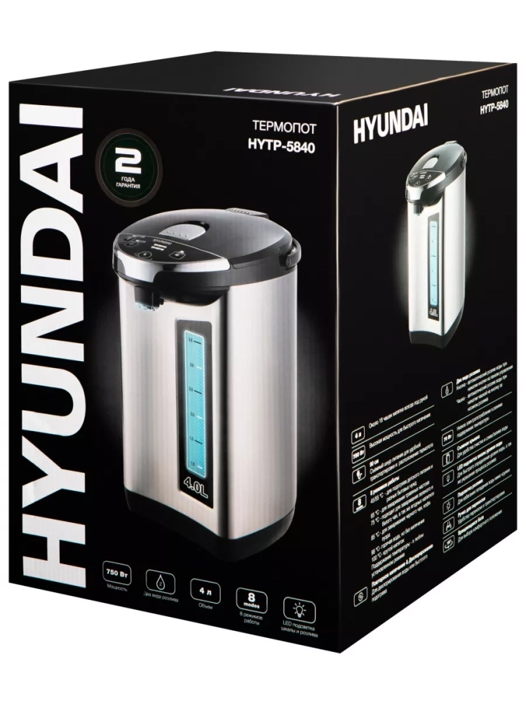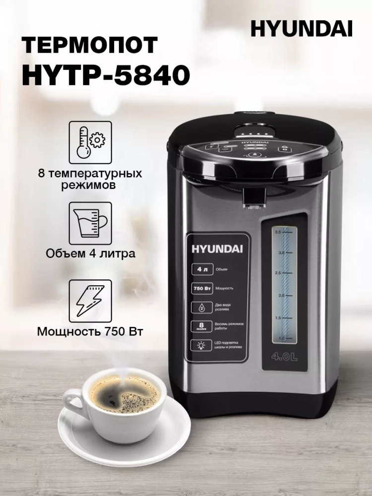 Термопот Hyundai HYTP-5840 — современное устройство для нагрева и поддержания температуры воды с удобной системой подачи и защитой от детей. Объем резервуара 4 литра обеспечивает горячей водой семью или небольшой коллектив. Прибор оснащен функцией автоматического кипячения и 7 температурными режимами (45°C-100°C) с точностью поддержания ±5°C, что делает его идеальным для приготовления чая, кофе и детского питания.