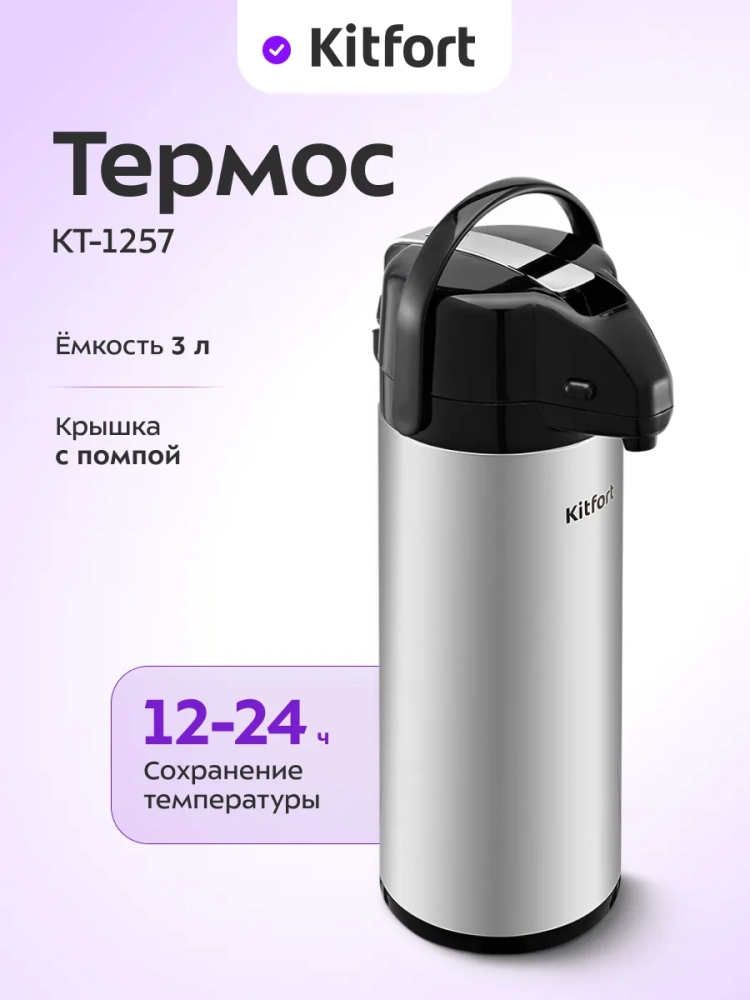 В термосе Kitfort КТ-1257 можно хранить как горячие, так и холодные напитки. Изделие сохраняет температуру содержимого в течение 12–24 часов.