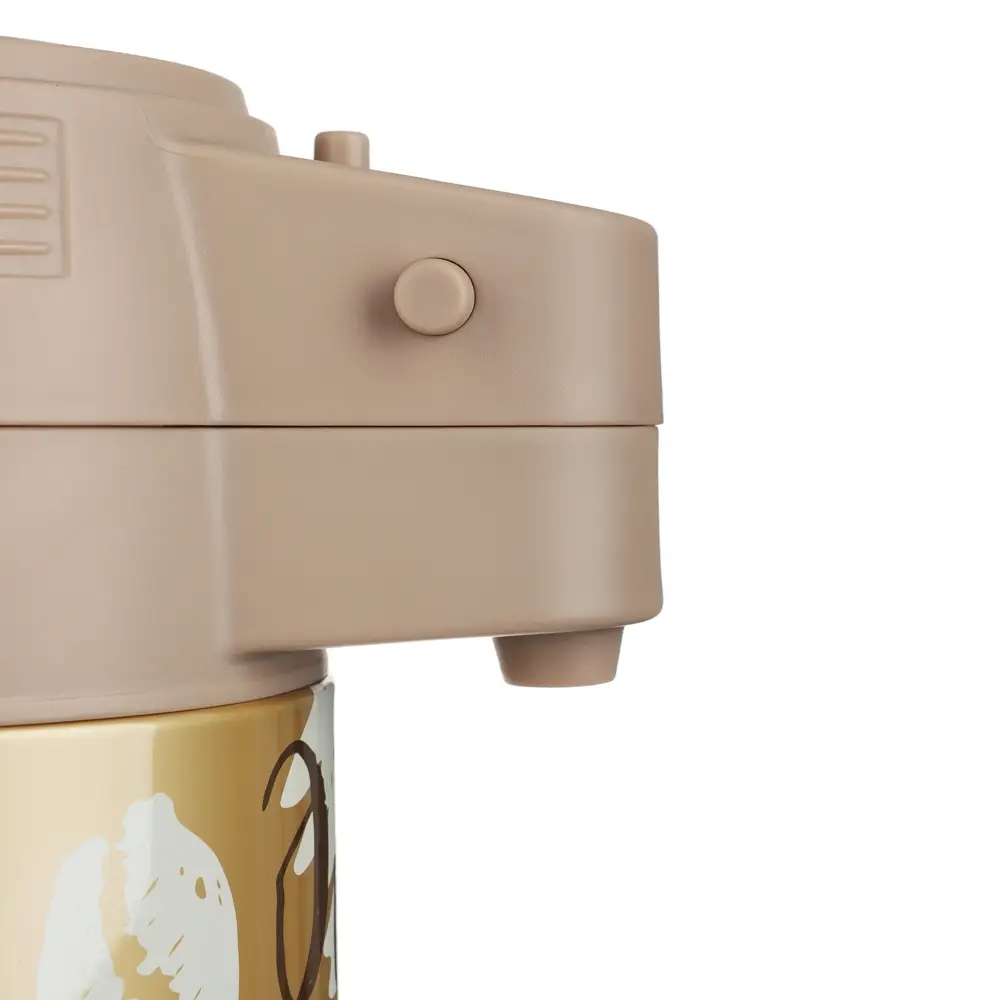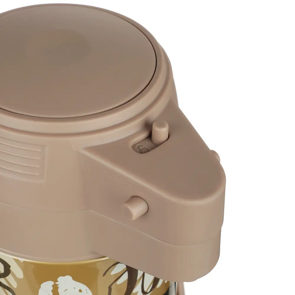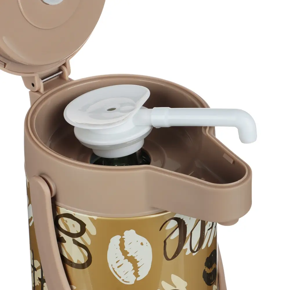 Термос оснащён пневмонасосом с кнопкой-дозатором, который позволяет наливать напиток без откручивания крышки, минимизируя потери тепла. Герметичная завинчивающаяся крышка предотвращает проливание, а удобный носик обеспечивает аккуратный и комфортный розлив.