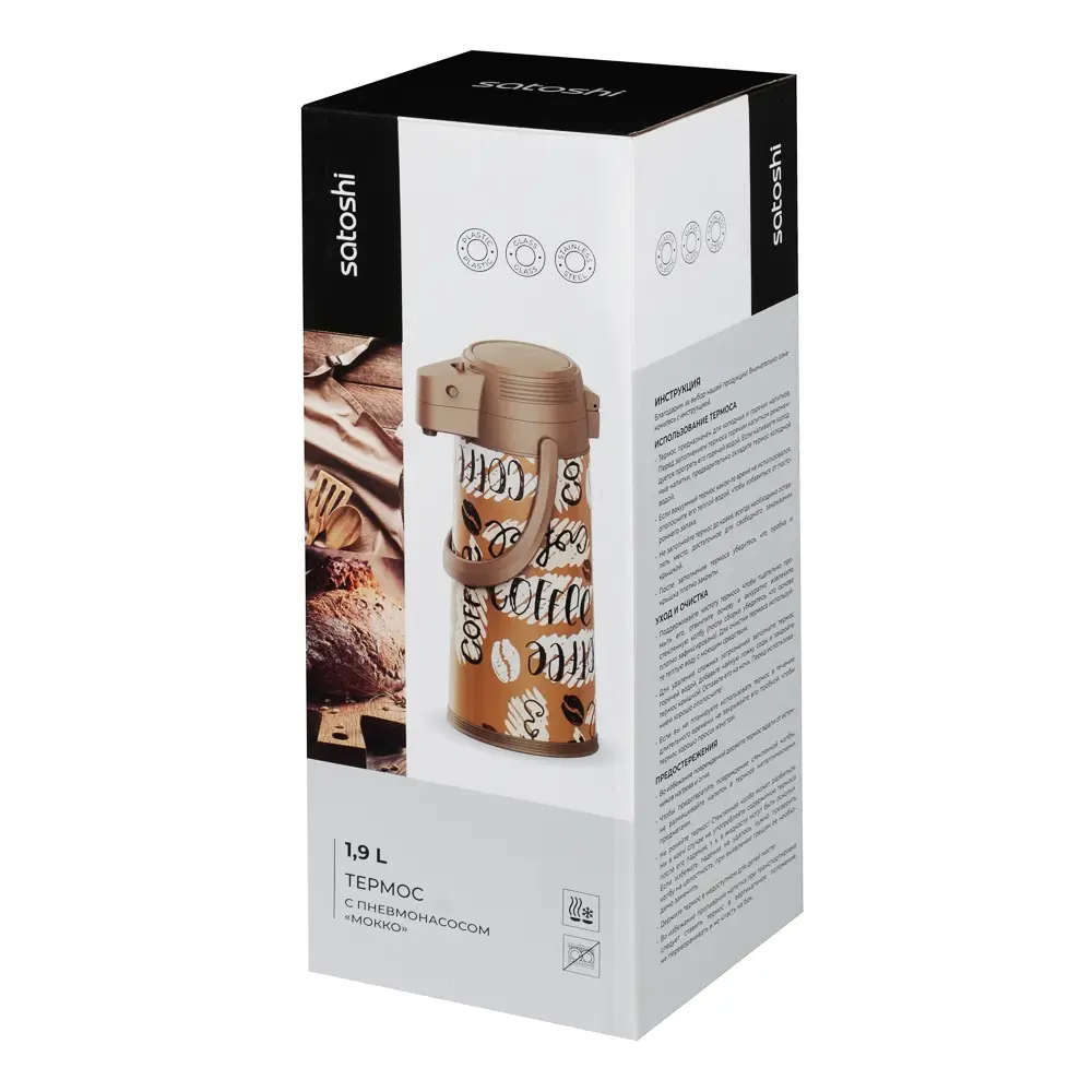 Термос SATOSHI «Мокко» со стеклянной колбой и пневмонасосом, 1,9 л — удобное и практичное решение для хранения и подачи горячих напитков дома, в офисе или на выездных мероприятиях. Он идеально подходит для чая, кофе и других напитков, которым важно долго сохранять температуру и натуральный вкус.