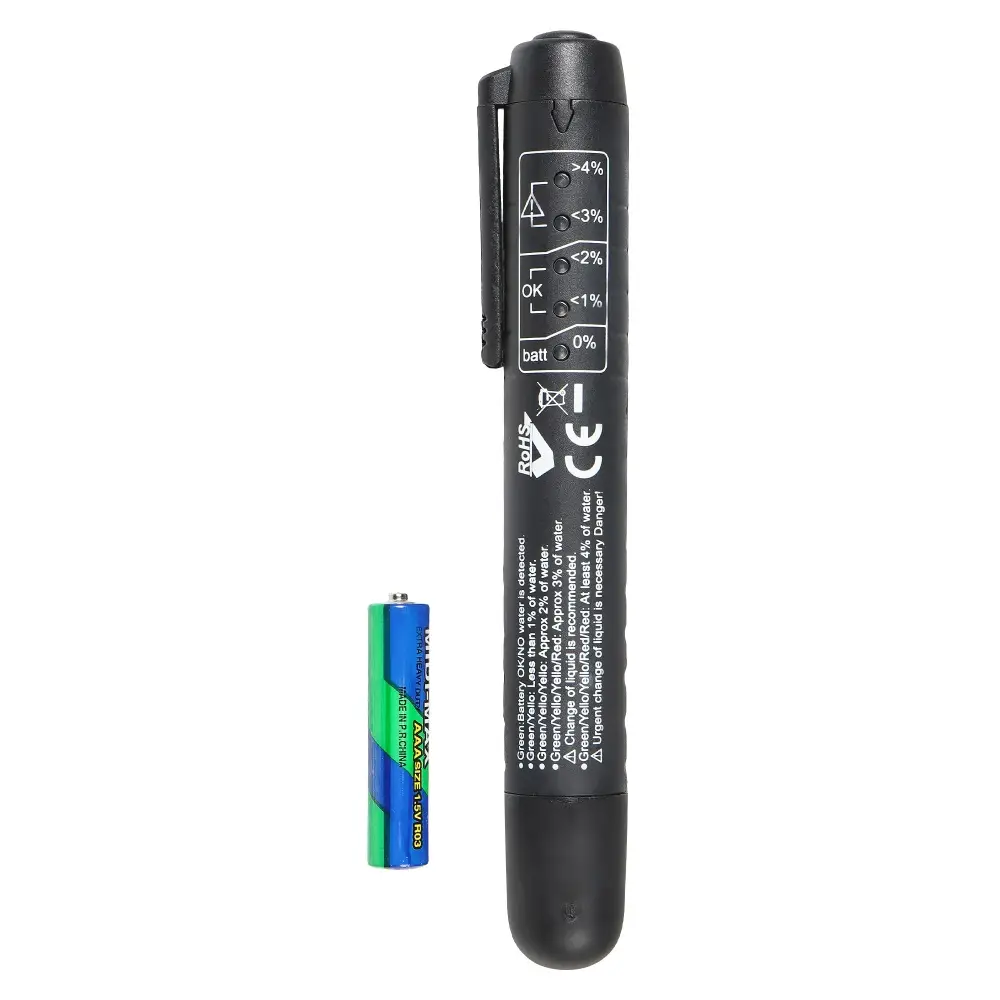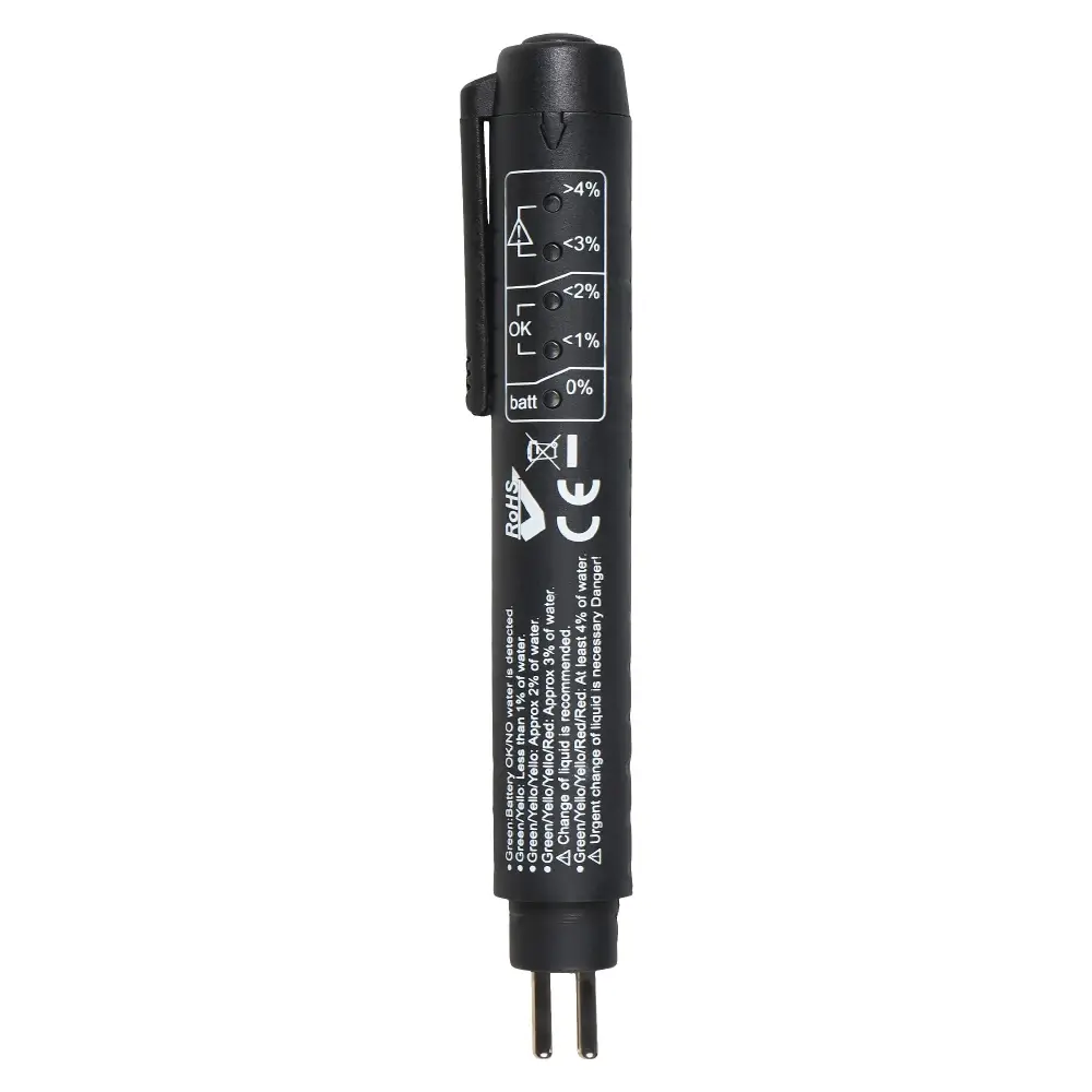Портативный тестер позволяет определить количество влаги, растворённой в тормозной жидкости. Для тестирования нужно погрузить электроды прибора в бачок с тормозной жидкостью. Отображение результата происходит при помощи светодиодных индикаторов разного цвета, в соответствии со шкалой, нанесенной возле них.