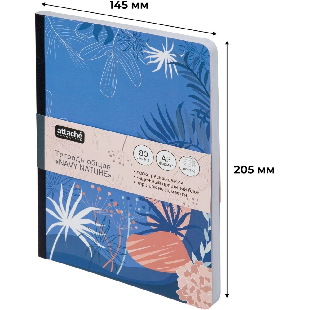 Тетрадь общая Attache Selection Navy nature Синий А5 80л клетка, сшивка