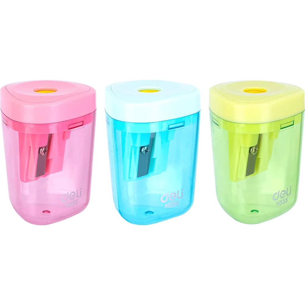 Точилка ручная Deli, 1 отв., контейнер, автомат. клапан, пластик, ассорти