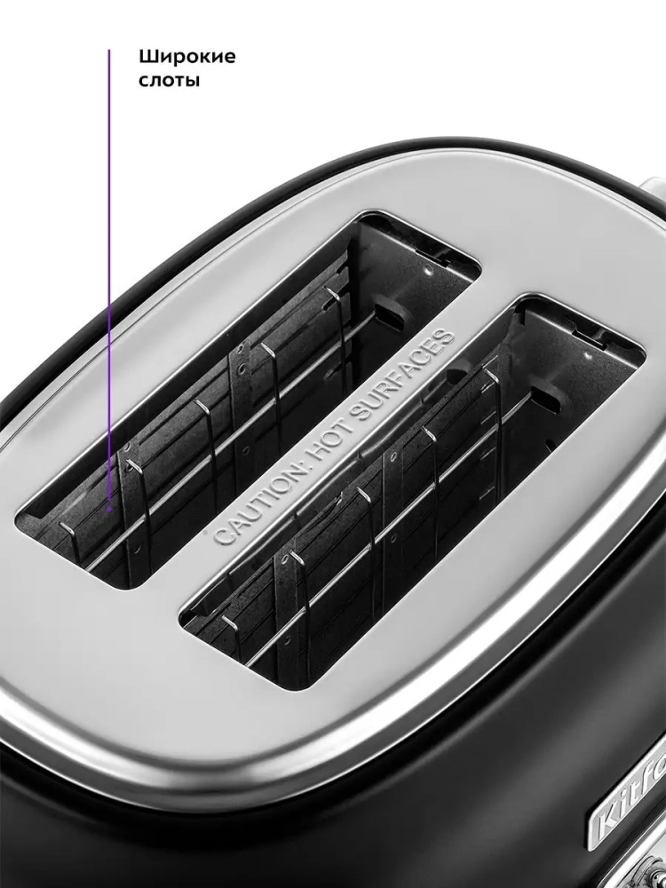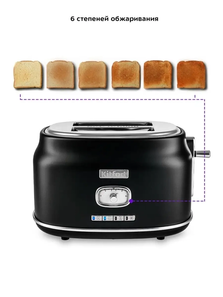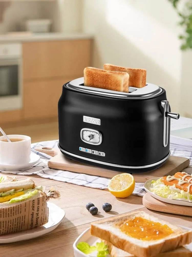 Тостер Китфорт оснащен поворотным регулятором степени обжаривания и четырьмя кнопками со световыми индикаторами. Режим подогрева служит для подогрева уже готовых тостов, если они остыли. Режим разморозки позволяет приготовить тосты из замороженного хлеба. Режим Бейгл позволяет поджарить рогалики или другие мучные изделия, которые требуют более интенсивной прожарки. Благодаря широким слотам можно поджаривать толстые куски хлеба, а не только тонкие. Загруженные тосты автоматически центрируются, чтобы их обжарка с двух сторон была равномерной независимо от толщины куска. По окончании приготовления тостер автоматически отключается, а тосты поднимаются вверх, чтобы их было удобнее извлечь. Вы можете приготовить 1 или 2 тоста одновременно.