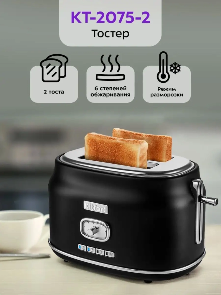 Электрический тостер Kitfort КТ-2075 создан для тех, кто любит полакомиться ароматным и хрустящим горячим поджаренным хлебом. Особый вкус и цвет корочки тостов получаются такими благодаря карамелизации сахара, содержащегося в муке, при инфракрасном нагреве в процессе приготовления.