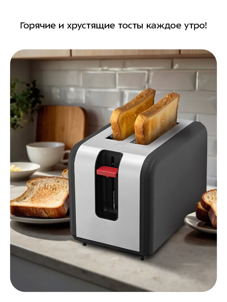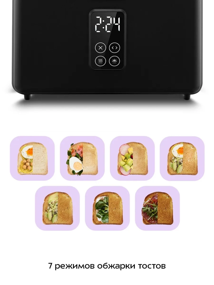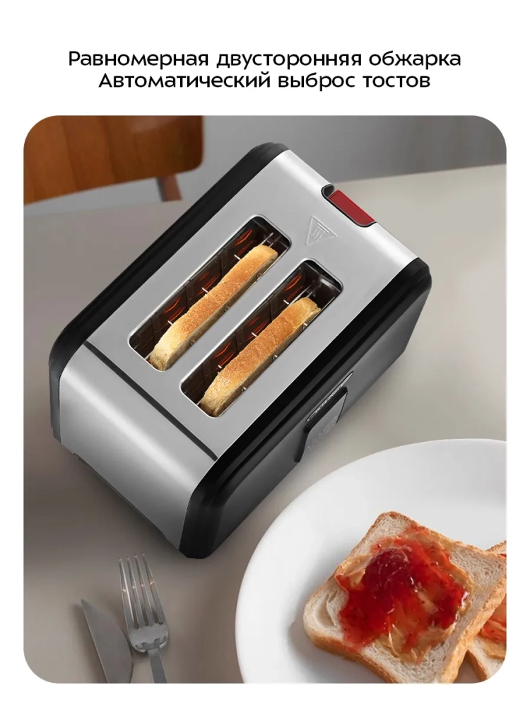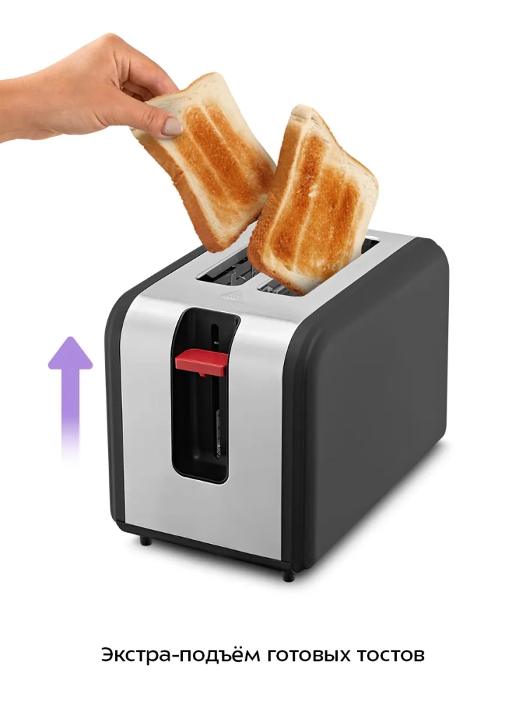 Тостер оснащен панелью управления с дисплеем и кнопками, с помощью которых регулируется степень обжаривания тоста, включаются режимы «Разгорев» и «Разморозка». Режим «Разогрев» служит для подогрева уже готовых тостов, если они остыли. Режим «Разморозка» позволяет приготовить тосты из замороженного хлеба. По окончании приготовления тостер автоматически отключается, а тосты поднимаются вверх, чтобы их было удобнее извлечь.