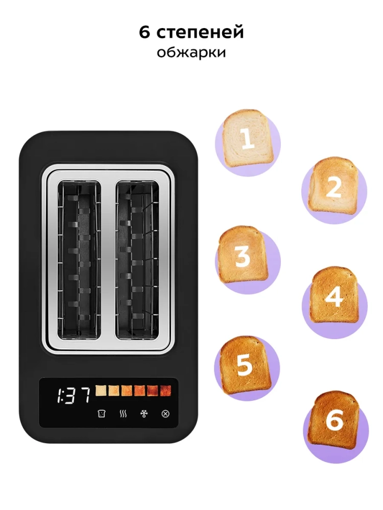 Тостер оснащен кнопкой выбора степени обжаривания и индикатором степени обжаривания. Встроенный дисплей отображает степень обжаривания и обратный отсчет времени. Режим «Разогрев» служит для подогрева уже готовых тостов, если они остыли. Режим «Разморозка» позволяет приготовить тосты из замороженного хлеба. По окончании приготовления тостер автоматически отключается, а тосты поднимаются вверх, чтобы их было удобнее извлечь.