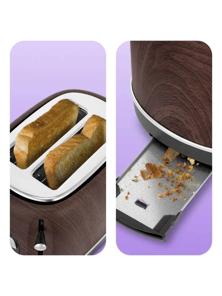 Корпус прибора выполнен из пластика со вставками из металла. Съемный поддон для крошек позволяет легко очистить тостер от хлебных крошек. Для удобного хранения на дне устройства предусмотрены держатели для шнура питания. Противоскользящие вставки на ножках делают тостер более устойчивым.