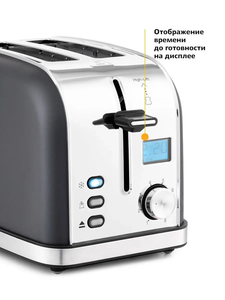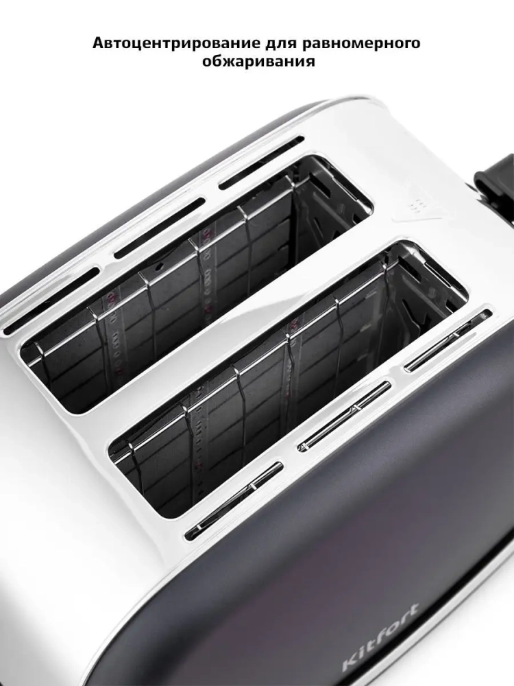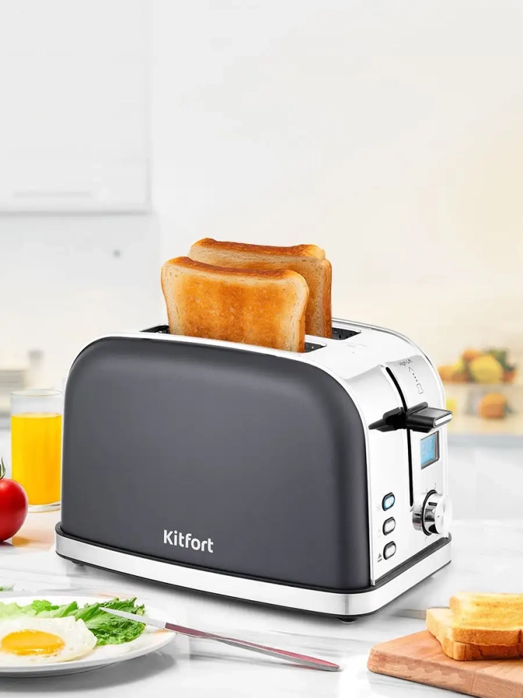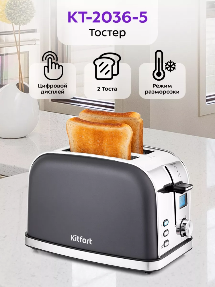 Электрический тостер Kitfort КТ-2036 создан для тех, кто любит полакомиться ароматным и хрустящим горячим поджаренным хлебом. Особый вкус и цвет корочки тостов получаются такими благодаря карамелизации сахара, содержащегося в муке, при инфракрасном нагреве в процессе приготовления. Тостер оснащен поворотным регулятором степени обжаривания, тремя кнопками со световыми индикаторами и жидкокристаллическим дисплеем. Режим разогрева служит для разогрева уже готовых тостов, если они остыли. Режим разморозки позволяет приготовить тосты из замороженного хлеба. Загруженные тосты автоматически центрируются, чтобы их обжарка с двух сторон была равномерной. Оставшееся время показывается на жидкокристаллическом дисплее и позволяет рассчитать приготовление чашки кофе или чая, пока готовится тост. По окончании приготовления тостер автоматически отключается, а тосты поднимаются вверх, чтобы их было удобнее извлечь. Вы можете приготовить 1 или 2 тоста одновременно.