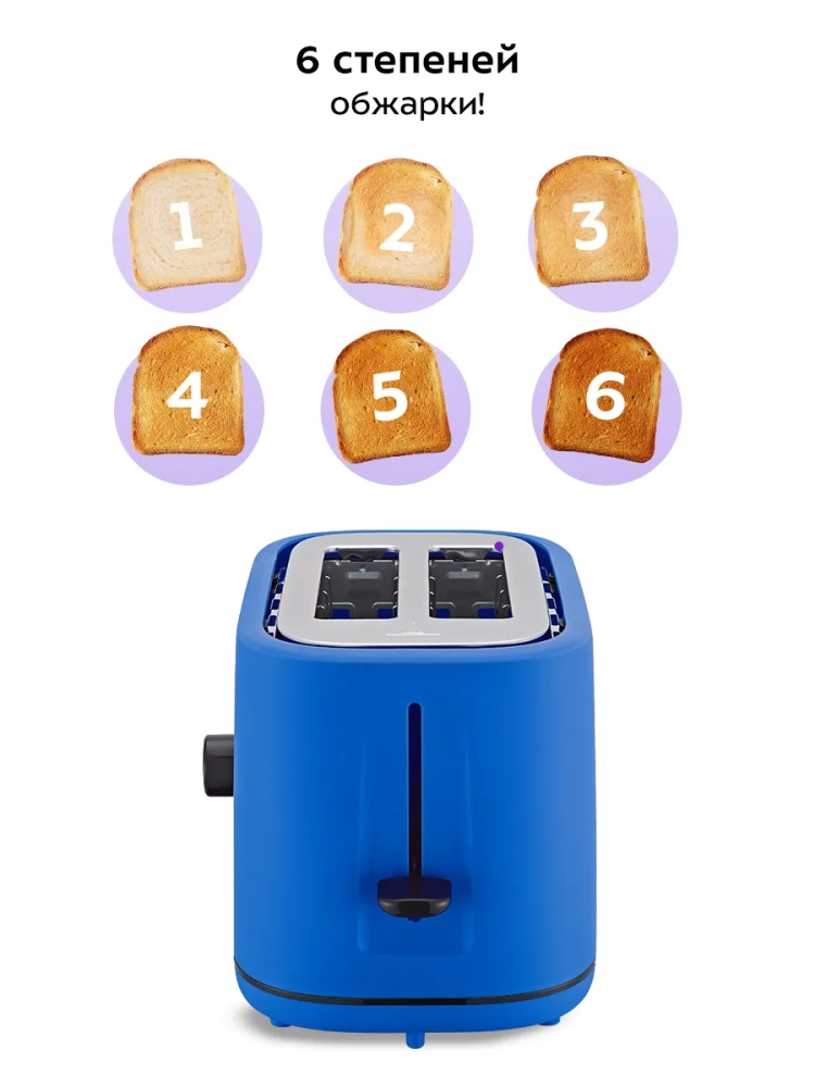 Тостер оснащен поворотным регулятором степени обжаривания и тремя кнопками со световыми индикаторами. Режим подогрева служит для подогрева уже готовых тостов, если они остыли. Режим разморозки позволяет приготовить тосты из замороженного хлеба. Загруженные тосты автоматически центрируются, чтобы их обжарка с двух сторон была равномерной независимо от толщины куска. По окончании приготовления тостер автоматически отключается, а тосты поднимаются вверх, чтобы их было удобнее извлечь. Механизм экстра-подъема позволяет приподнять выше тосты небольшого размера для их удобного извлечения. Вы можете приготовить 1 или 2 тоста одновременно.