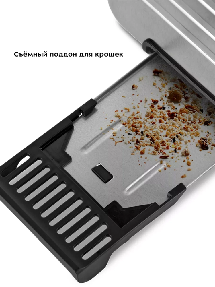 Съемный поддон для крошек позволяет легко и удобно очистить тостер от хлебных крошек.