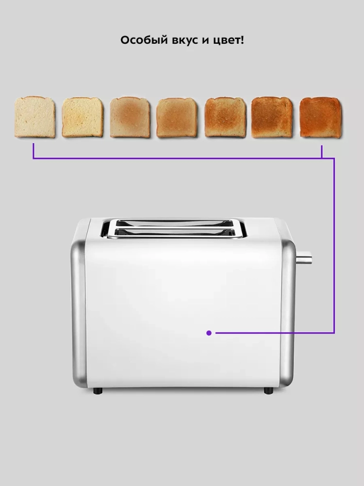 В приборе предусмотрено 7 степеней обжарки тостов, которые отличаются временем обжарки: «1» — означает минимальное время и легкую (светлую) обжарку, «7» — максимальное время и сильную (темную) обжарку.
