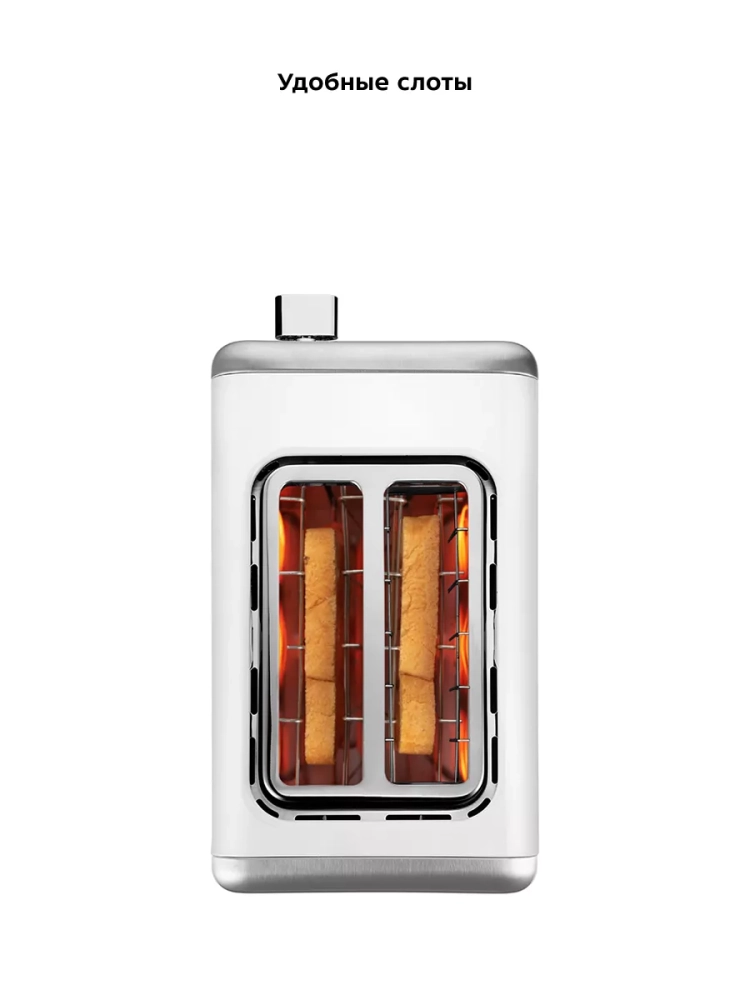 Загруженные тосты или выпечка автоматически центрируются, чтобы их обжарка с двух сторон была равномерной независимо от толщины куска. По окончании приготовления тостер автоматически отключается, а тосты поднимаются вверх, чтобы их было удобнее извлечь. Механизм экстра-подъема позволяет приподнять выше тосты небольшого размера для их удобного извлечения.