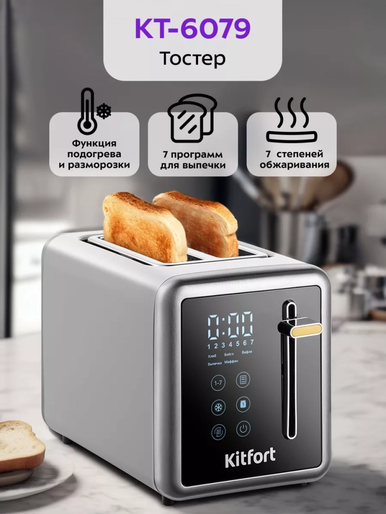 Тостер Kitfort КТ-6079 создан для тех, кто любит полакомиться ароматным и хрустящим горячим поджаренным хлебом. Особый вкус и цвет корочки тостов получаются такими благодаря карамелизации сахара, содержащегося в хлебе, при инфракрасном нагреве в процессе приготовления.