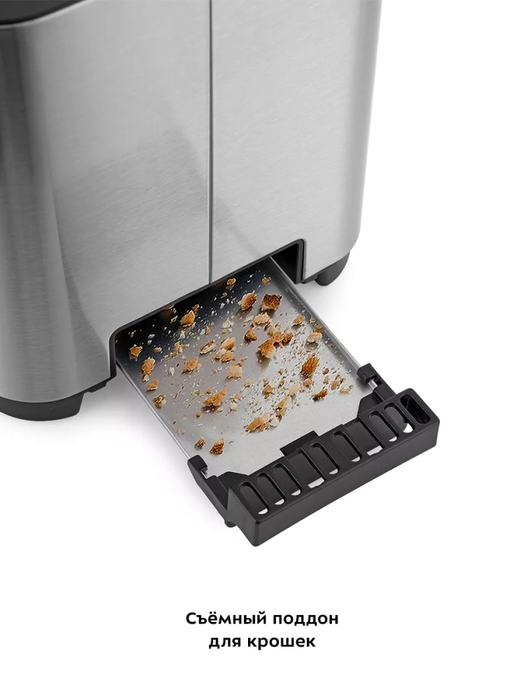 Снизу расположен съемный поддон для крошек, поэтому чистить тостер просто и удобно.