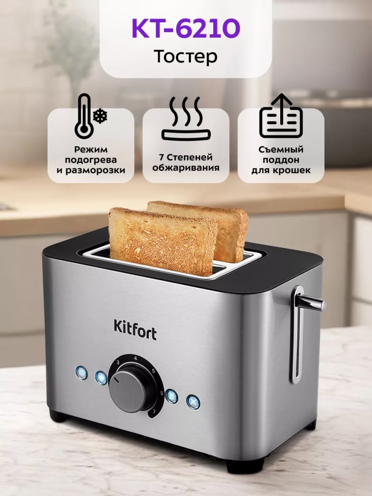 Электрический тостер Kitfort КТ-6210 создан для тех, кто любит полакомиться ароматным и хрустящим горячим поджаренным хлебом. Особый вкус и цвет корочки тостов получаются такими благодаря карамелизации сахара, содержащегося в тесте, при инфракрасном нагреве в процессе приготовления.