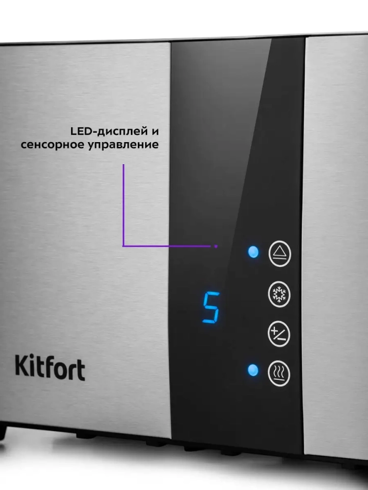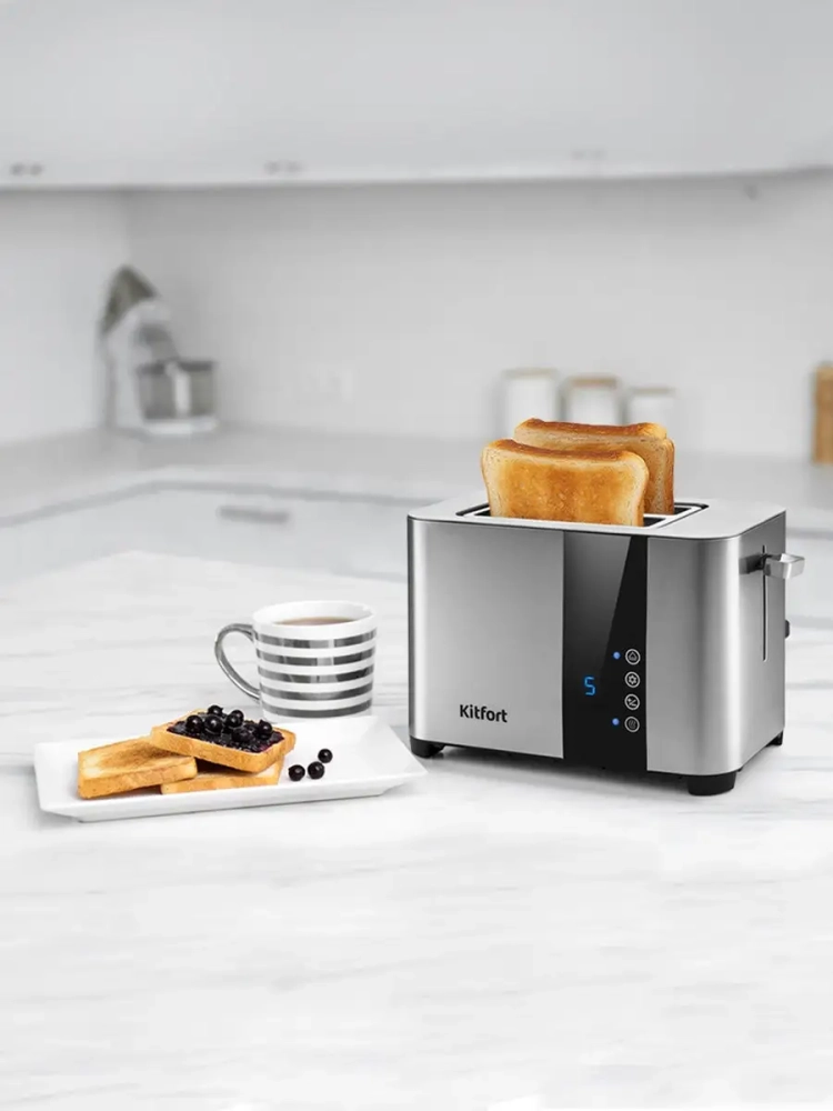 Тостер Китфорт оснащен панелью управления с LCD-дисплеем и сенсорными кнопками, с помощью которых регулируется степень поджаривания, а также включаются режимы «Подогрев» или «Разморозка». Режим «Подогрев» служит для разогрева уже готовых тостов, если они остыли, а режим «Разморозка» позволяет приготовить тосты даже из замороженного хлеба. Благодаря семи степеням поджаривания вы можете приготовить горячие тосты на любой вкус и из любых видов хлеба.