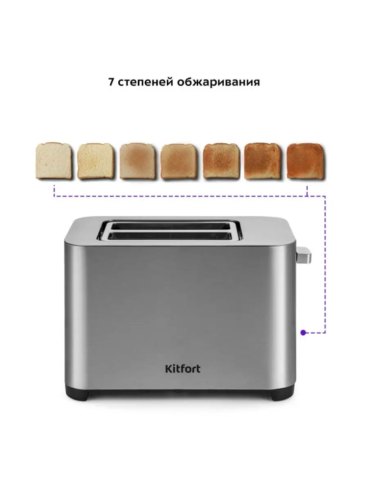 Тостер Китфорт оснащен панелью управления с LED-дисплеем и сенсорными кнопками, с помощью которых регулируется степень поджаривания, а также включаются режимы «Подогрев» или «Разморозка». Режим «Подогрев» служит для разогрева уже готовых тостов, если они остыли, а режим «Разморозка» позволяет приготовить тосты даже из замороженного хлеба. Благодаря семи степеням поджаривания вы можете приготовить горячие тосты на любой вкус и из любых видов хлеба.