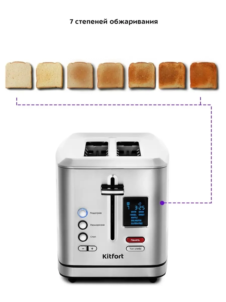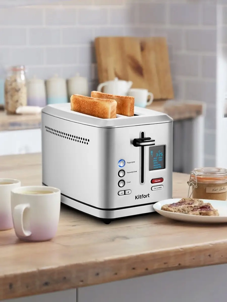 Тостер Китфорт оснащен панелью управления с LED-дисплеем. При помощи кнопок на панели управления регулируется степень поджаривания, а также включаются режимы «Подогрев» или «Разморозка». Режим «Подогрев» служит для разогрева уже готовых тостов, если они остыли, а режим «Разморозка» позволяет приготовить тосты даже из замороженного хлеба. Благодаря семи степеням поджаривания вы можете приготовить горячие тосты на любой вкус и из любых видов хлеба.