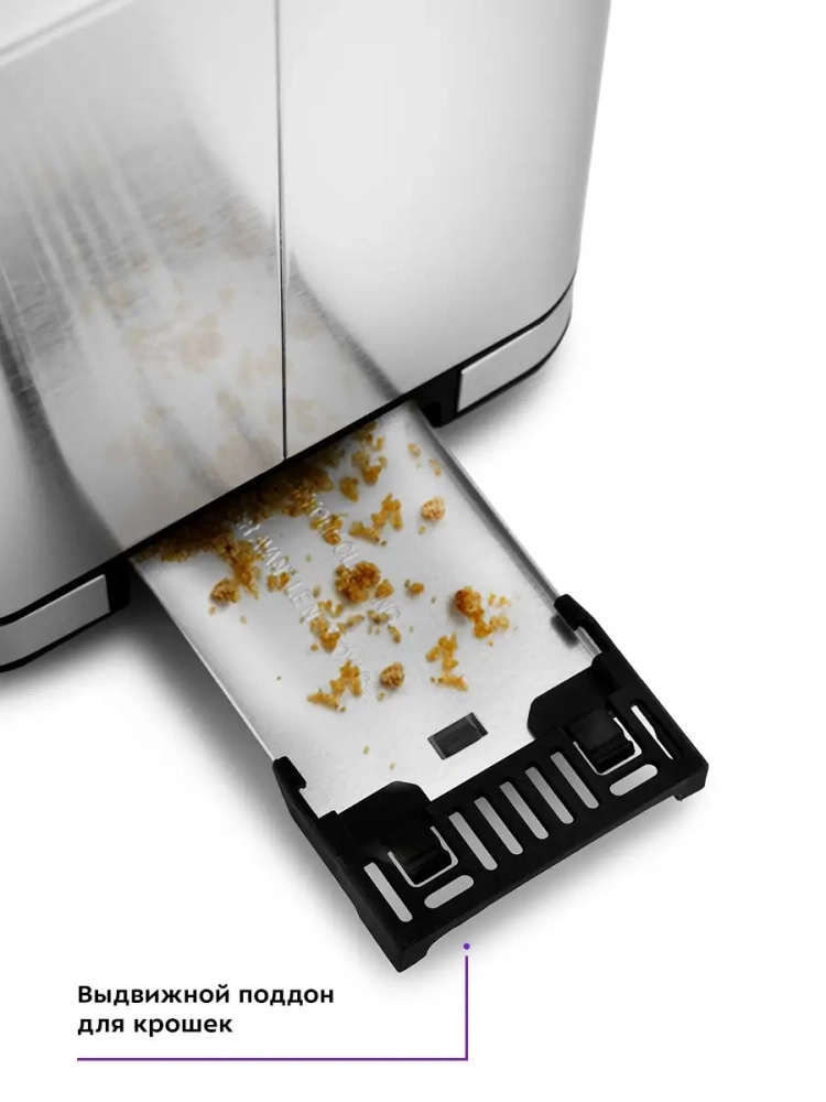 В нижней части корпуса тостера расположен выдвижной поддон для крошек, поэтому чистить тостер просто и удобно.