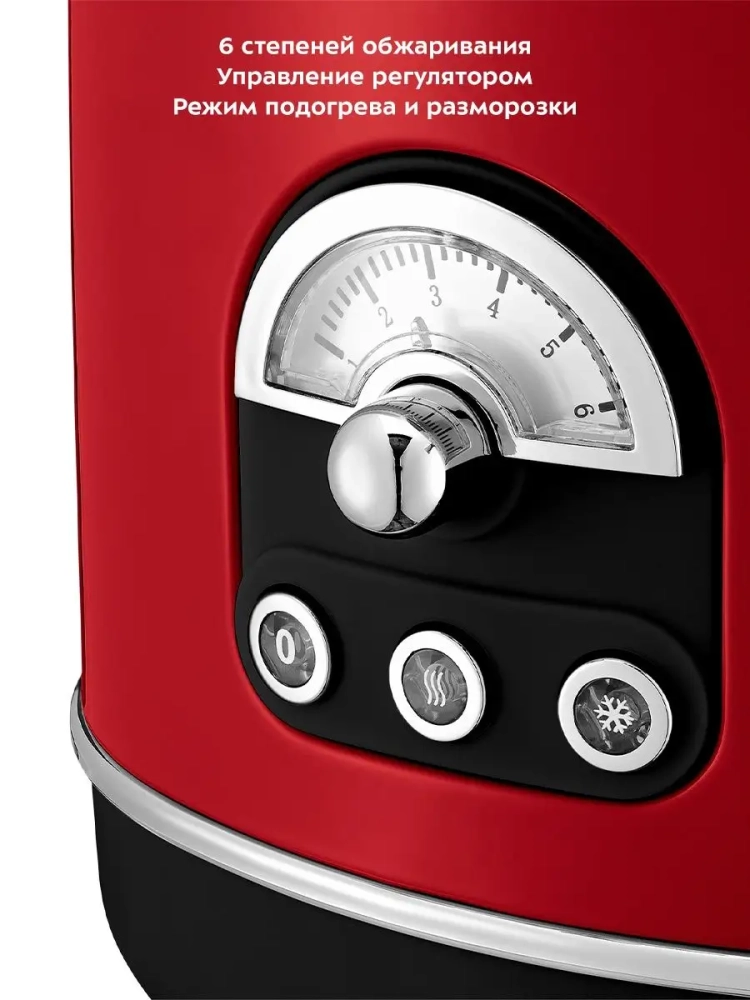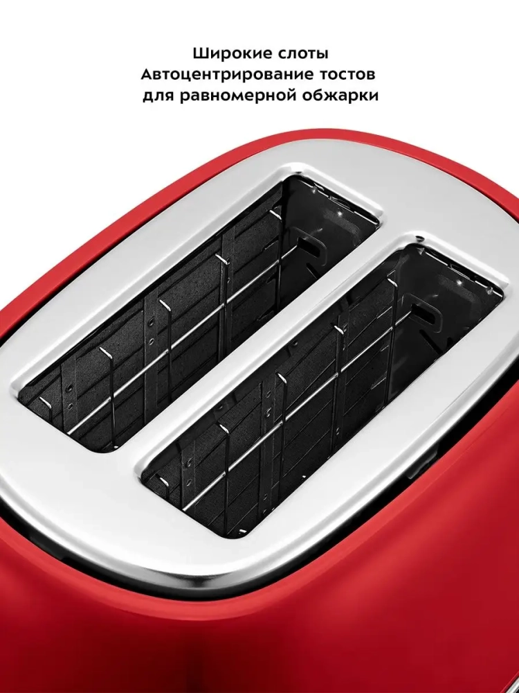Тостер оснащен поворотным регулятором степени обжаривания и тремя кнопками со световыми индикаторами. Режим подогрева служит для подогрева уже готовых тостов, если они остыли. Режим разморозки позволяет приготовить тосты из замороженного хлеба. Благодаря широким слотам можно поджаривать толстые куски хлеба, а не только тонкие. Загруженные тосты автоматически центрируются, чтобы их обжарка с двух сторон была равномерной независимо от толщины куска. По окончании приготовления тостер автоматически отключается, а тосты поднимаются вверх, чтобы их было удобнее извлечь. Механизм экстра-подъема позволяет приподнять тосты выше для удобного извлечения тостов небольшого размера. Вы можете приготовить 1 тост или одновременно 2.
