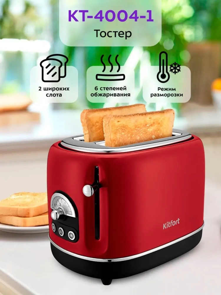 Электрический тостер Kitfort КТ-4004 создан для тех, кто любит полакомиться ароматным и хрустящим горячим поджаренным хлебом. Особый вкус и цвет корочки тостов получаются такими благодаря карамелизации сахара, содержащегося в муке, при инфракрасном нагреве в процессе приготовления.