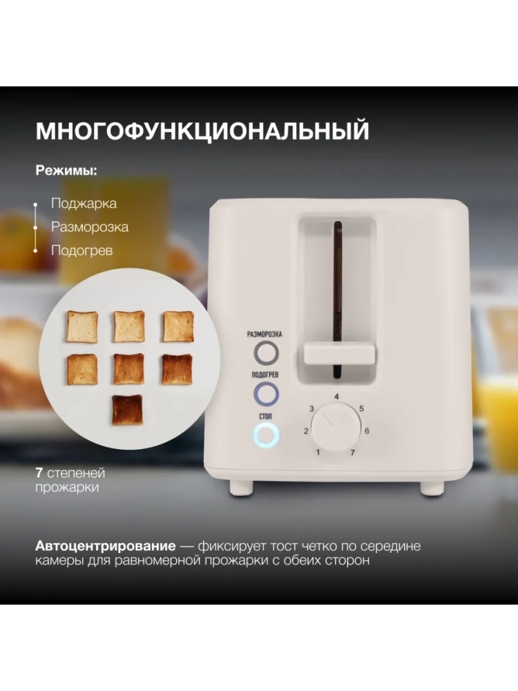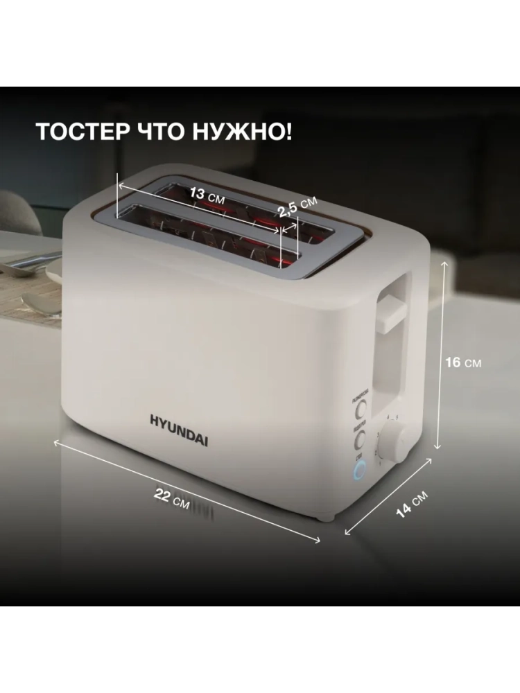 Тостер Hyundai HYT-3306 кремовый, мощность 700Вт, количество отделений: 2. Компактный тостер со стандартными слотами для двух тостов, торцевое управление и приятный тепло белый цвет. Только тостер, все что нужно. Автоцентрирование тостов. Бесступенчатый терморегулятор. Выдвижной (съемный) лоток для крошек. Подогрев готовых тостов.