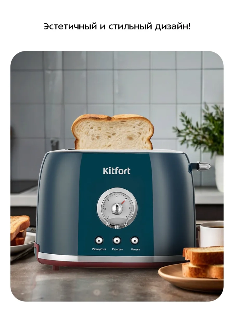 Тостер оснащен поворотным регулятором степени обжаривания и тремя кнопками. Режим разогрева служит для разогрева уже готовых тостов, если они остыли. Режим разморозки позволяет приготовить тосты из замороженного хлеба.